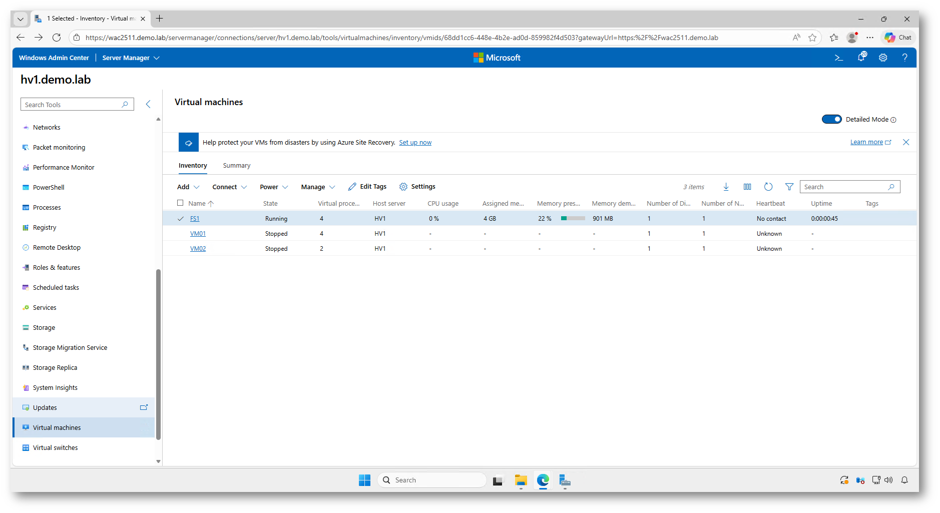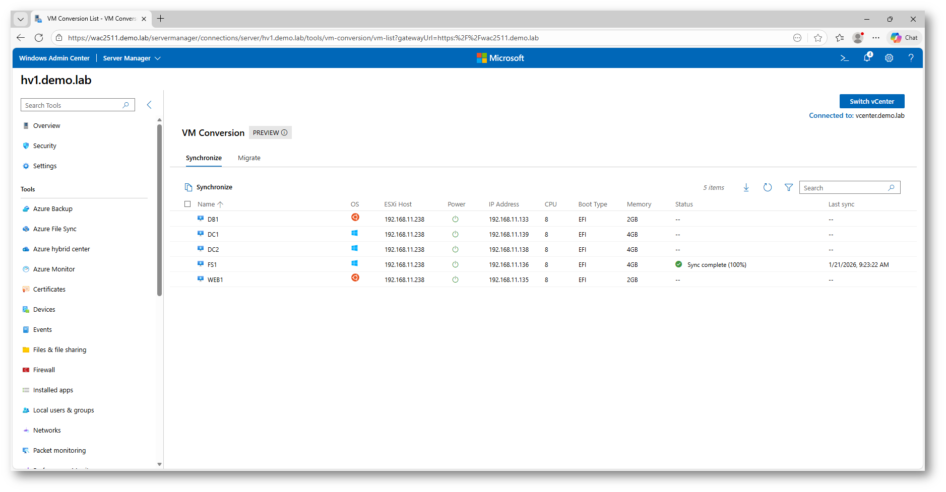 Figura 12: Stato della sincronizzazione delle macchine virtuali in Windows Admin Center