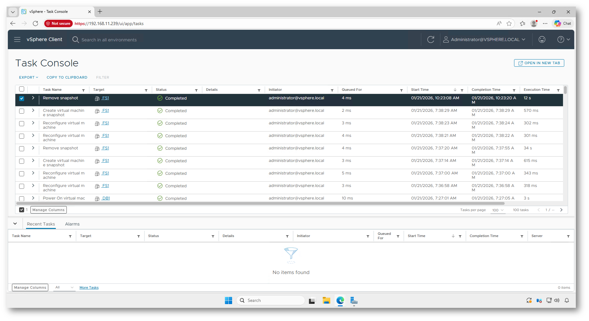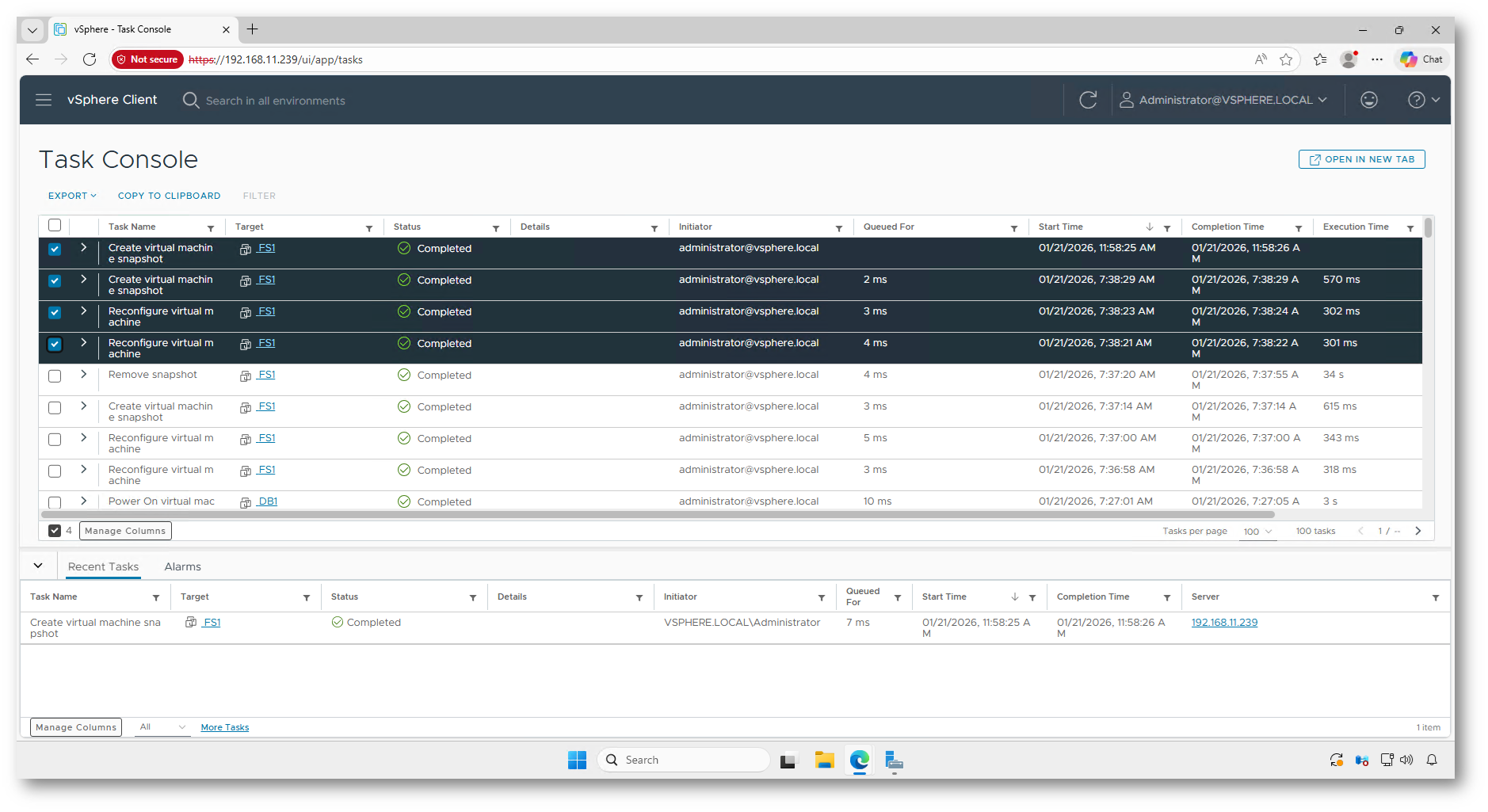 In questa fase vCenter registra attività come la creazione degli snapshot, la riconfigurazione temporanea della VM e le successive operazioni necessarie alla replica differenziale dei dati. Questi passaggi sono indispensabili per garantire la consistenza dei dischi durante il cutover e vengono avviati automaticamente da Windows Admin Center, senza interventi manuali da parte dell’amministratore.