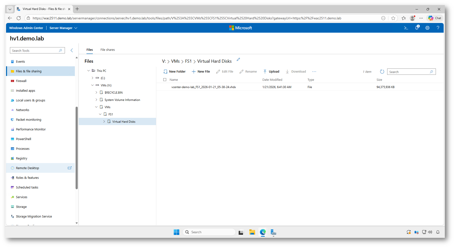Al termine della sincronizzazione è possibile verificare direttamente i dischi migrati accedendo alla sezione Files & file sharing di Windows Admin Center. Nel percorso di destinazione selezionato durante la sincronizzazione viene creato il file VHDX, corrispondente al disco della macchina virtuale VMware.