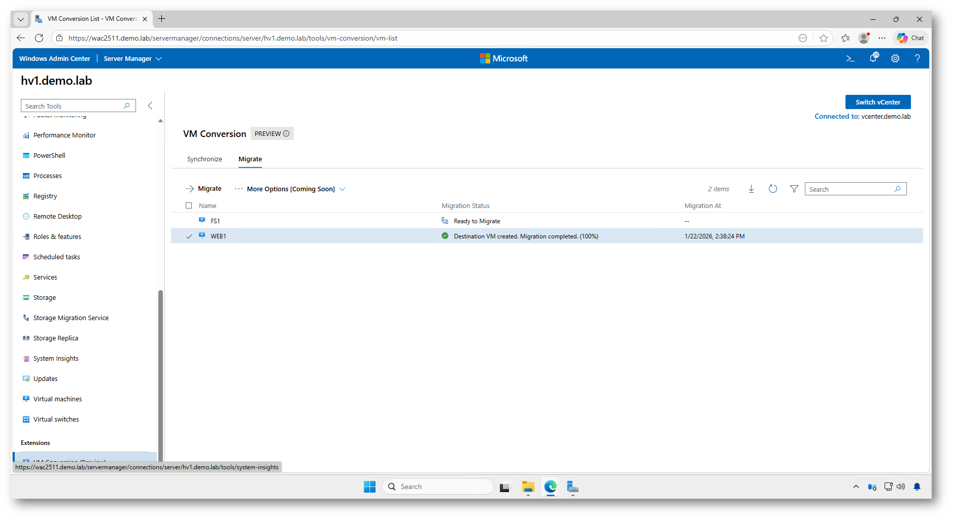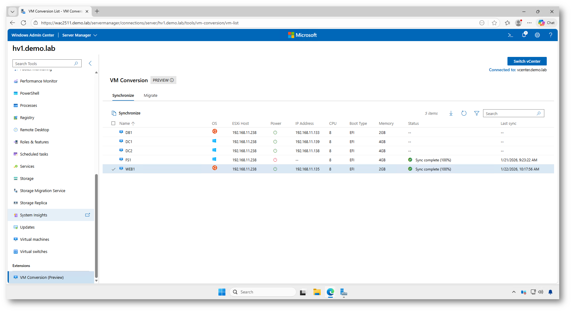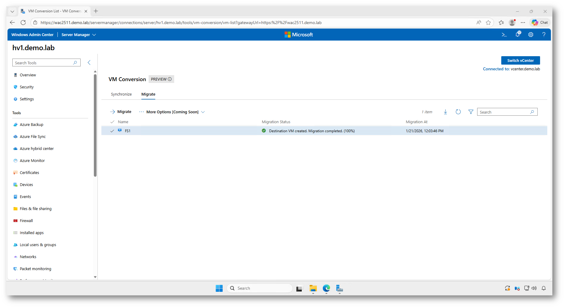 Figura 15: Sincronizzazione completata al 100% in Windows Admin Center: la macchina virtuale è pronta per la migrazione finale verso Hyper-V