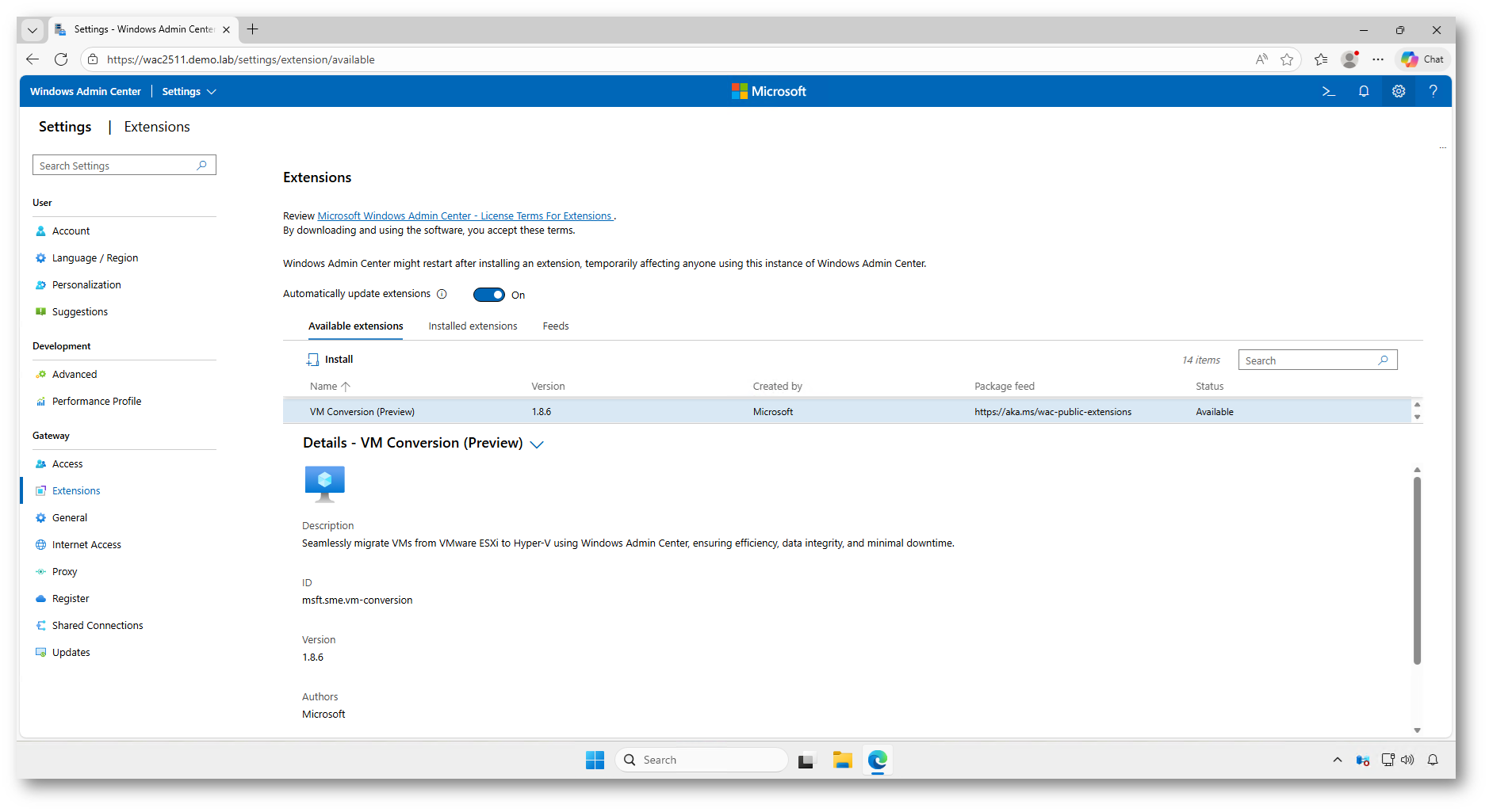 Per abilitare la migrazione da VMware a Hyper-V è necessario installare l’estensione VM Conversion (Preview) all’interno del Windows Admin Center Gateway.