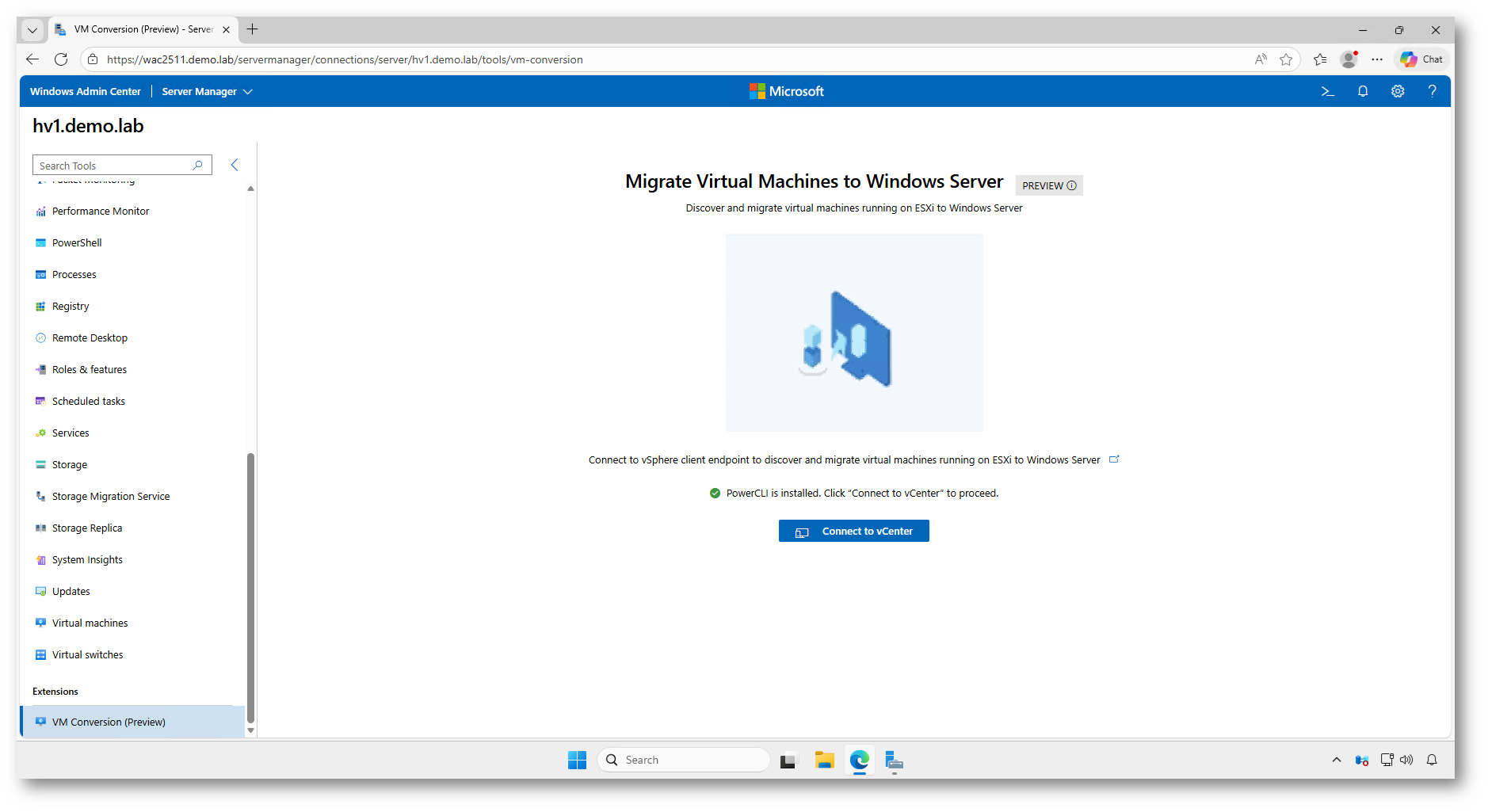 Infine, è necessario che sul Gateway sia installata e abilitata l’estensione VM Conversion (Preview). Senza questa estensione, Windows Admin Center non esporrà le funzionalità necessarie per avviare e gestire il processo di migrazione, anche se tutti gli altri prerequisiti risultano soddisfatti.