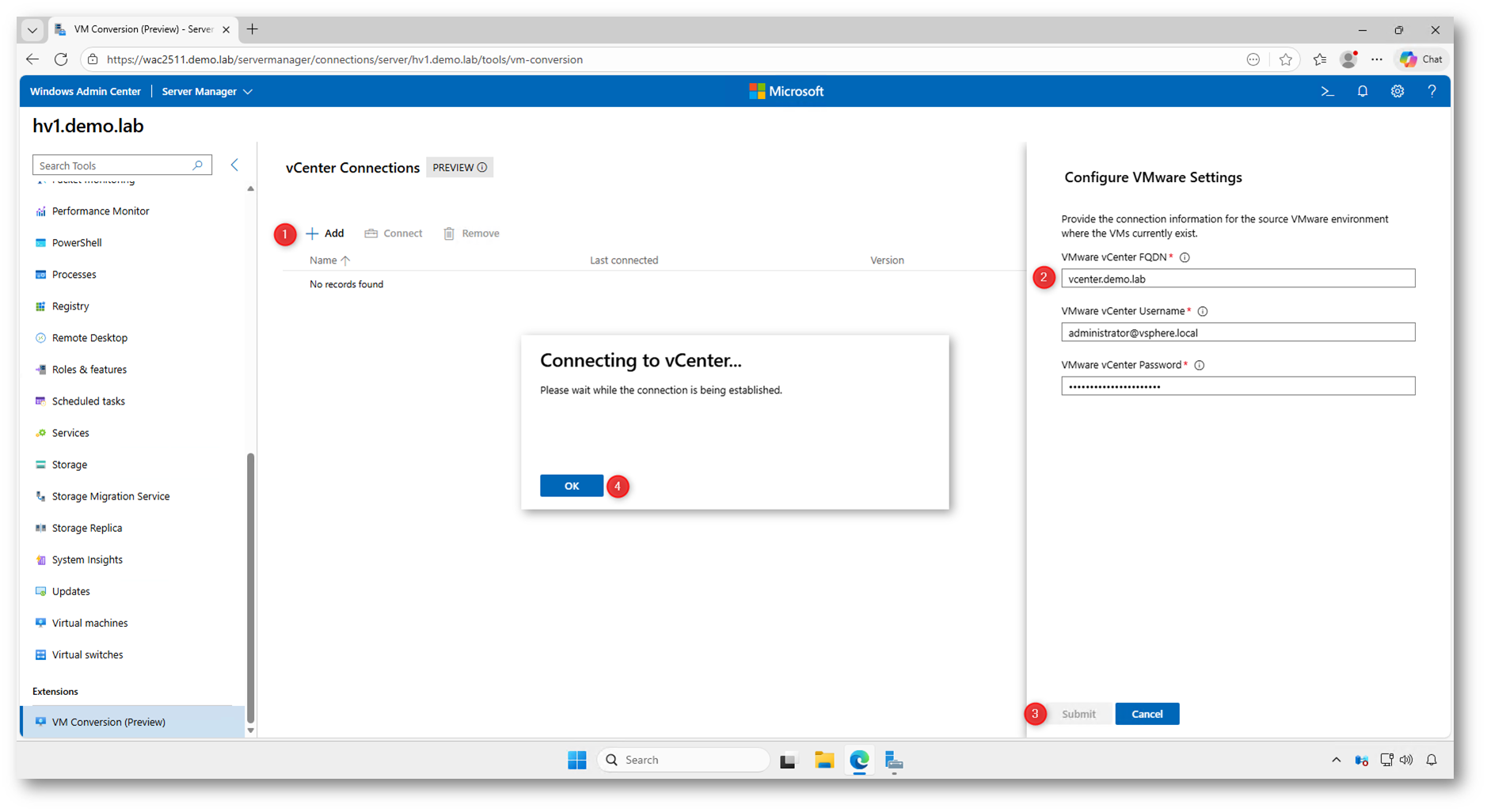 Durante questa fase Windows Admin Center verifica automaticamente la raggiungibilità del vCenter e la correttezza delle credenziali. In caso di esito positivo, l’ambiente VMware viene aggiunto all’elenco degli endpoint disponibili e diventa immediatamente selezionabile per le operazioni di migrazione.