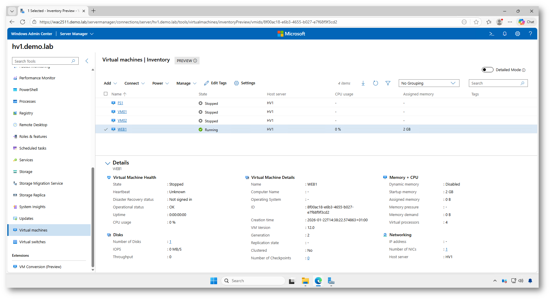 Figura 33: Verifica della macchina virtuale migrata tramite Windows Admin Center (WAC): la VM è presente nell’inventario di Hyper-V ed è in esecuzione correttamente