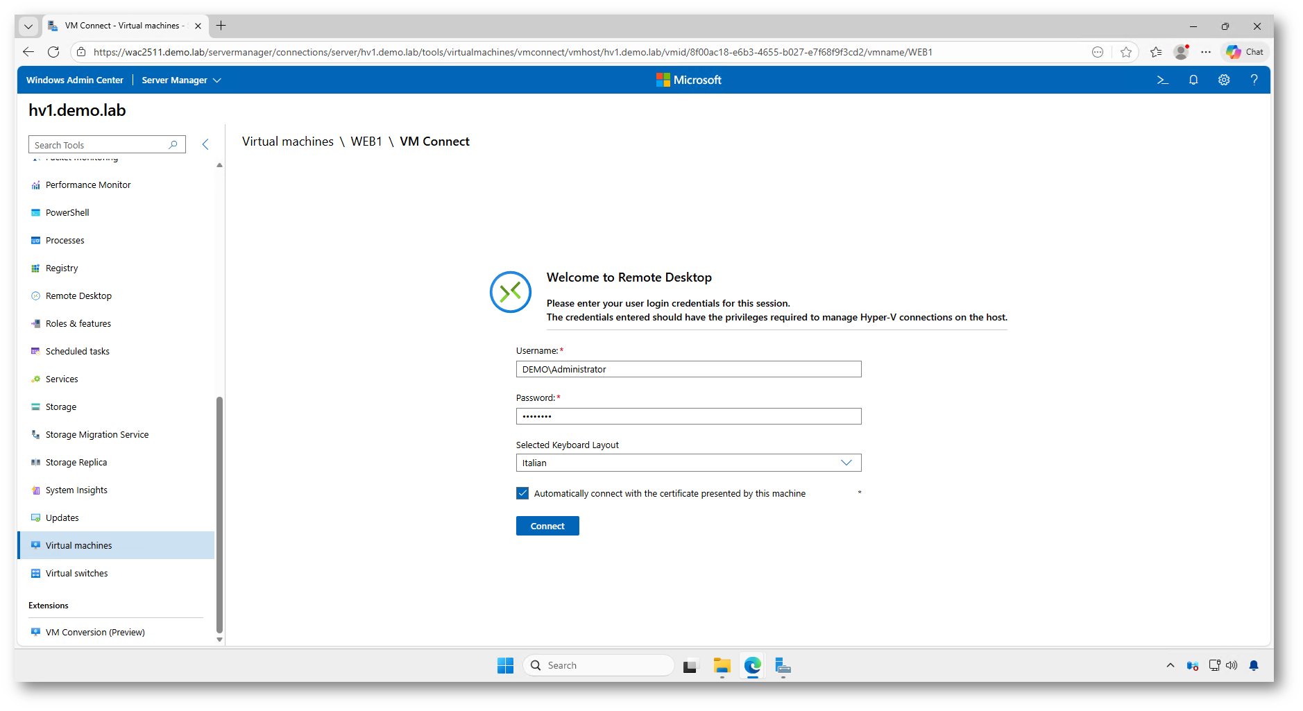 Dopo aver verificato la presenza della macchina virtuale su Hyper-V, mi sono collegato direttamente dalla console di Windows Admin Center utilizzando la funzionalità VM Connect, per accedere alla VM e validarne il corretto avvio e funzionamento operativo.
