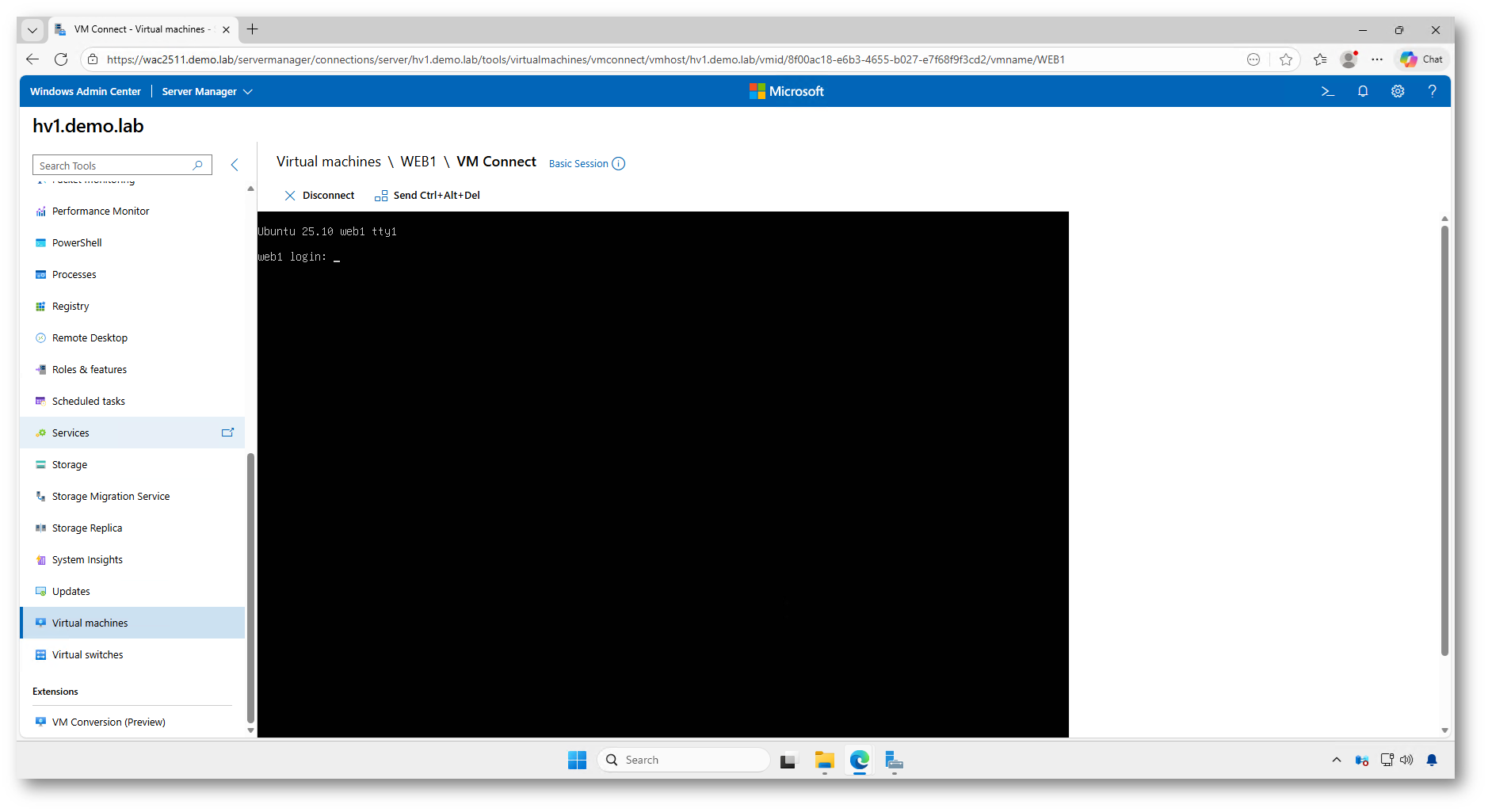 Figura35: Accesso alla console della macchina virtuale Linux (WEB1) tramite VM Connect in Windows Admin Center, per verificare il corretto avvio del sistema operativo dopo la migrazione
