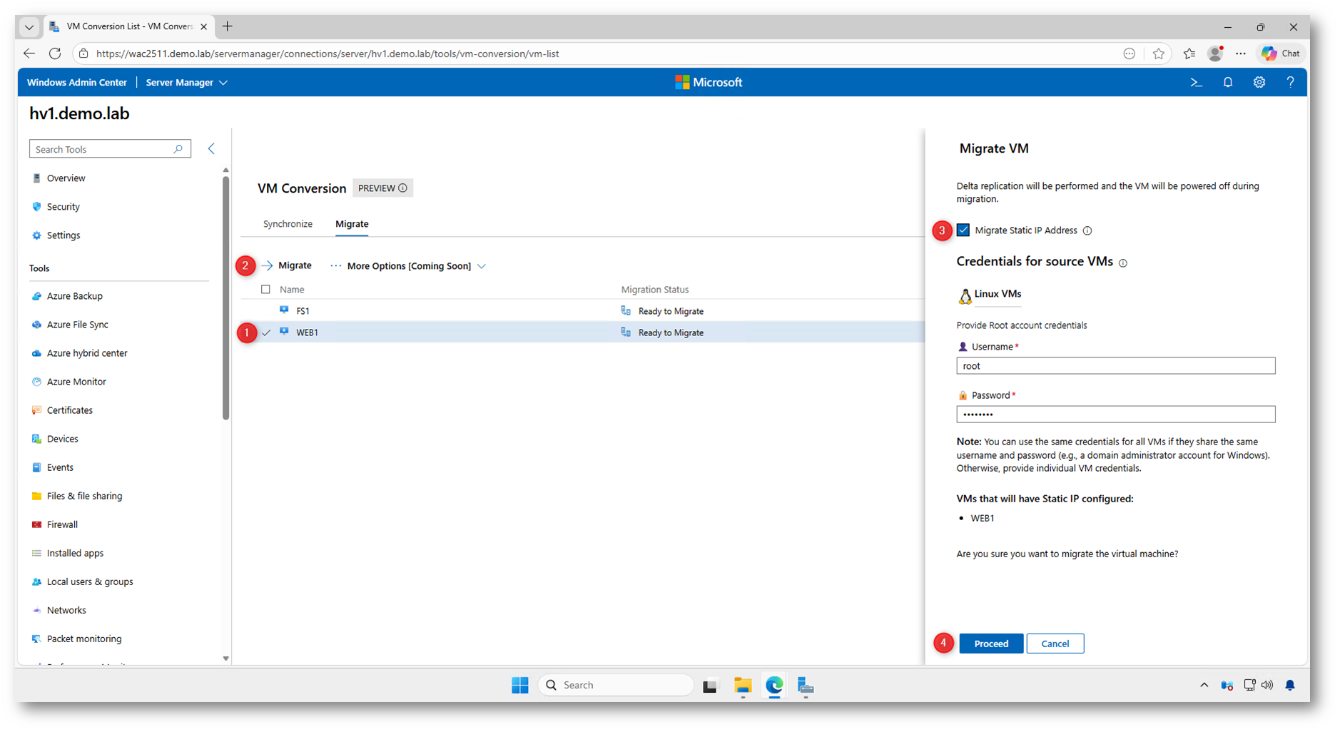 Nota: Durante la migrazione delle macchine virtuali è necessario mantenere attiva la sessione del browser connessa a Windows Admin Center. In caso di chiusura della finestra o di timeout della sessione, il processo di migrazione potrebbe sospendersi o interrompersi, richiedendo un nuovo intervento manuale per riprendere l’operazione.