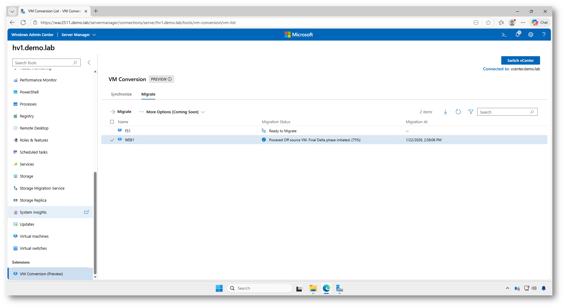Rispetto alle versioni precedenti di Windows Admin Center, già trattate nella mia guida Windows Admin Center 2511: novità, installazione e nuove funzionalità – ICT Power, dove si menzionava l’esistenza dell’estensione in anteprima, questa funzionalità rappresenta un passo significativo verso una migrazione integrata e nativa nel flusso di lavoro WAC, eliminando molte delle complessità storiche associate alle conversioni manuali o basate su tool legacy.