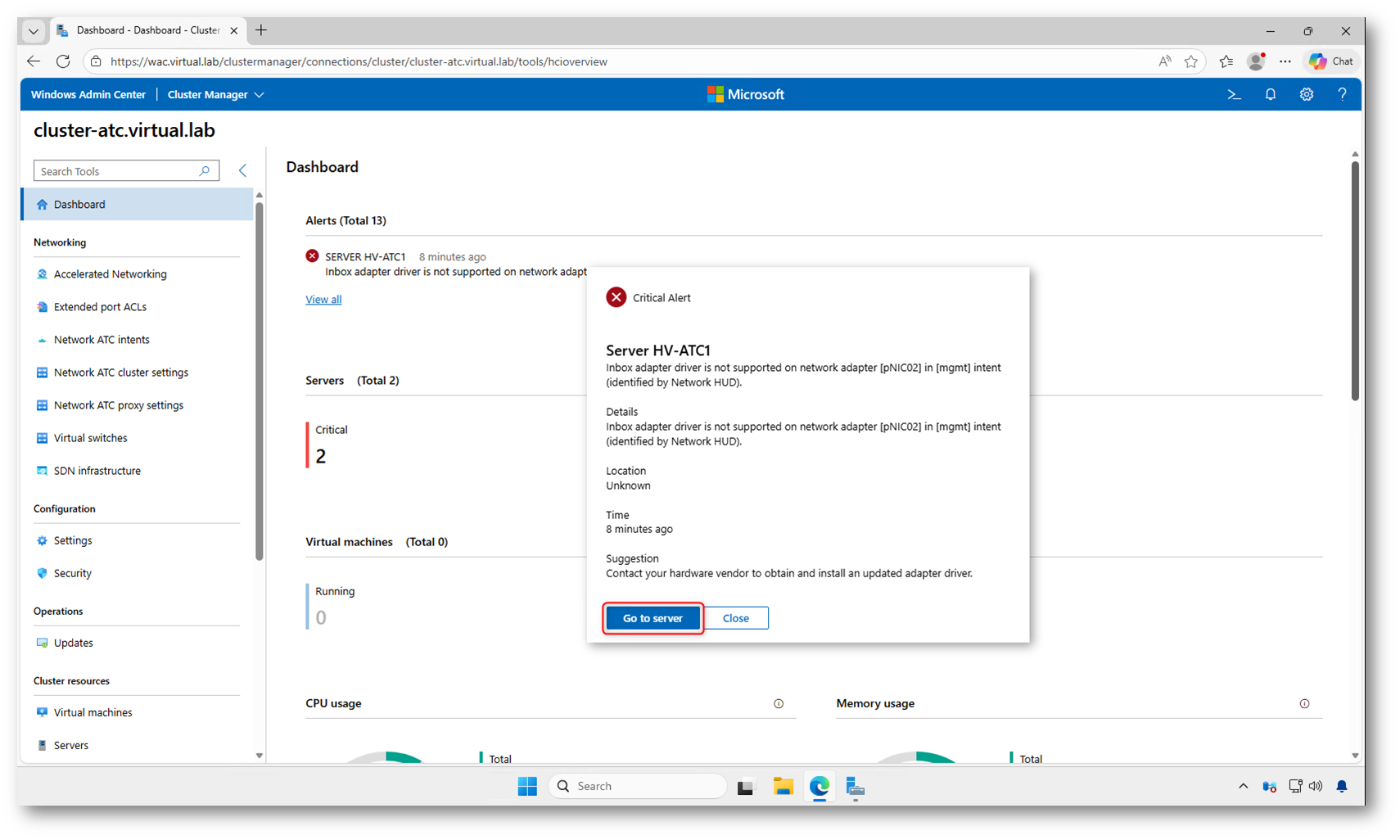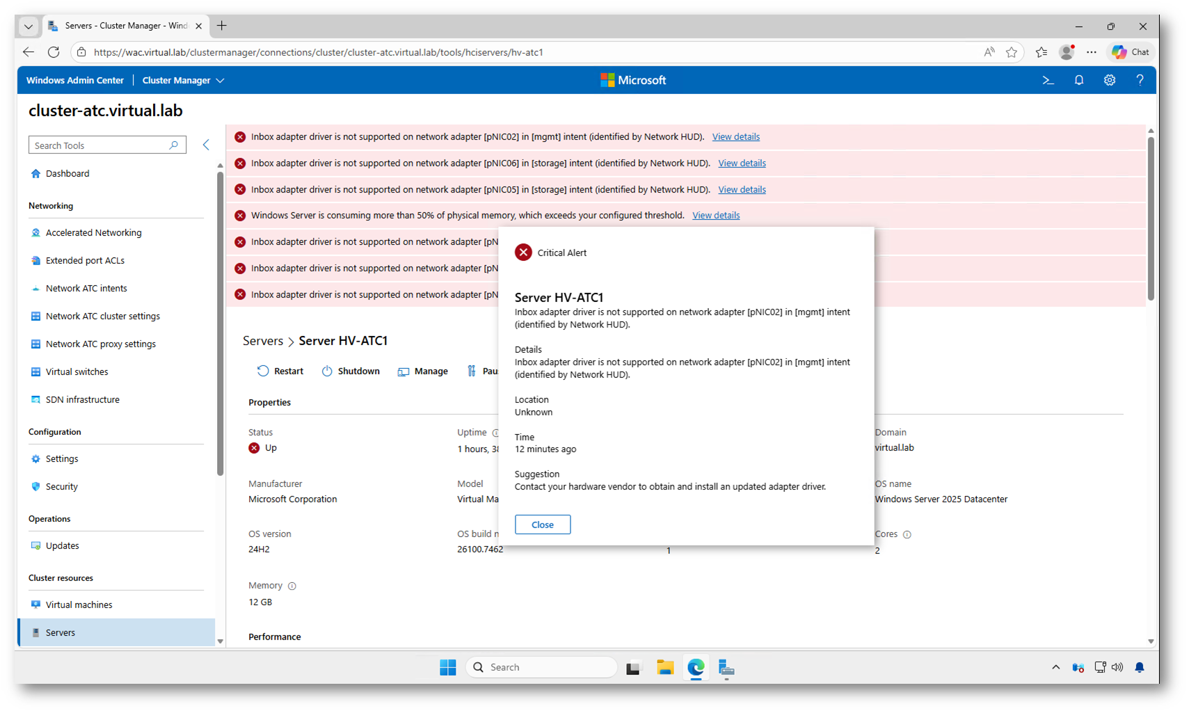 Il modo più semplice per controllare il funzionamento è tramite Windows Admin Center, collegandovi al cluster e verificando la presenza di eventuali alert nella dashboard o nella sezione degli avvisi. Se Network HUD rileva anomalie, queste compariranno tra i fault del cluster.