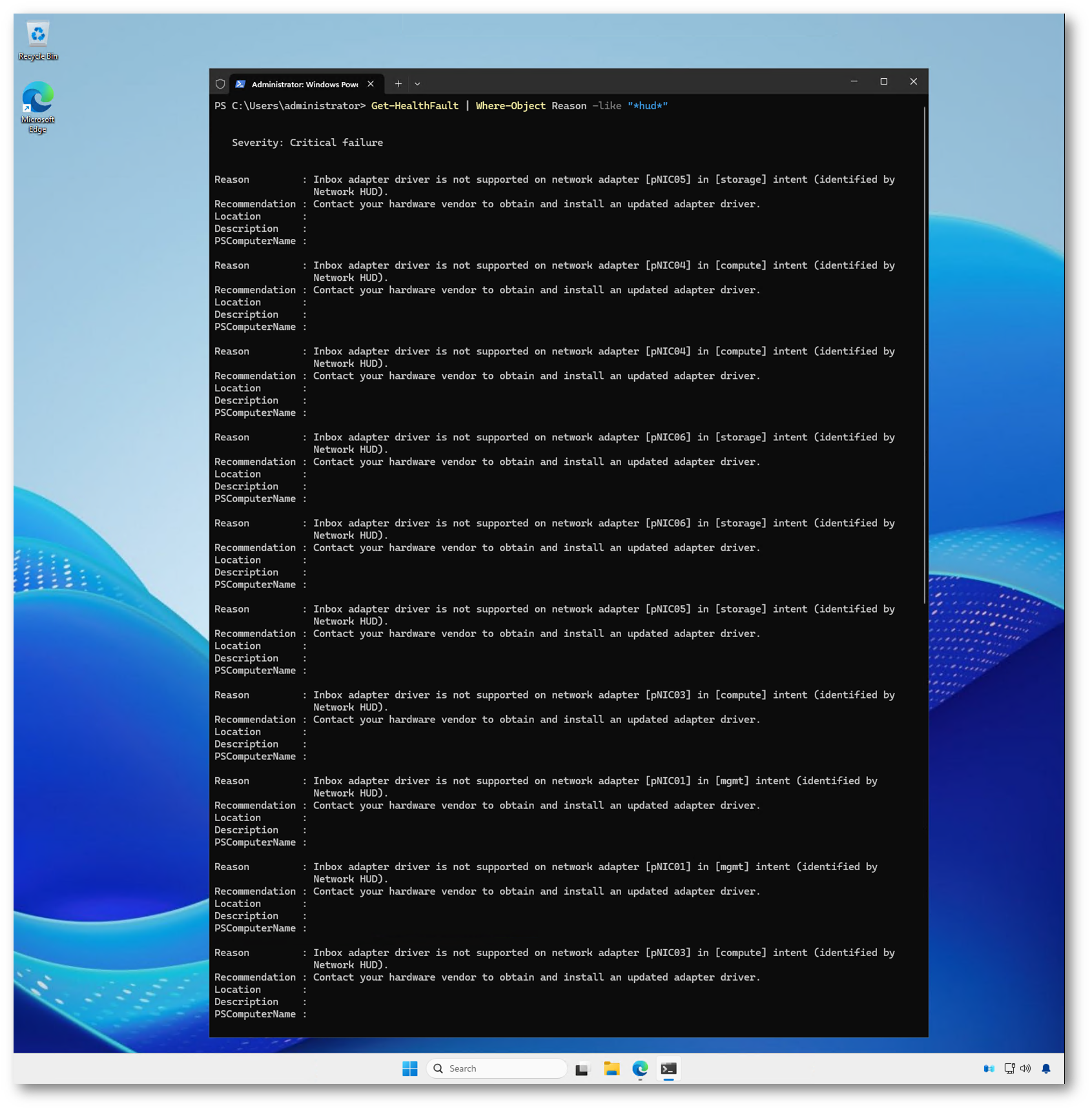 Figura 11: Verifica degli alert di Network HUD tramite PowerShell con il comando Get-HealthFault