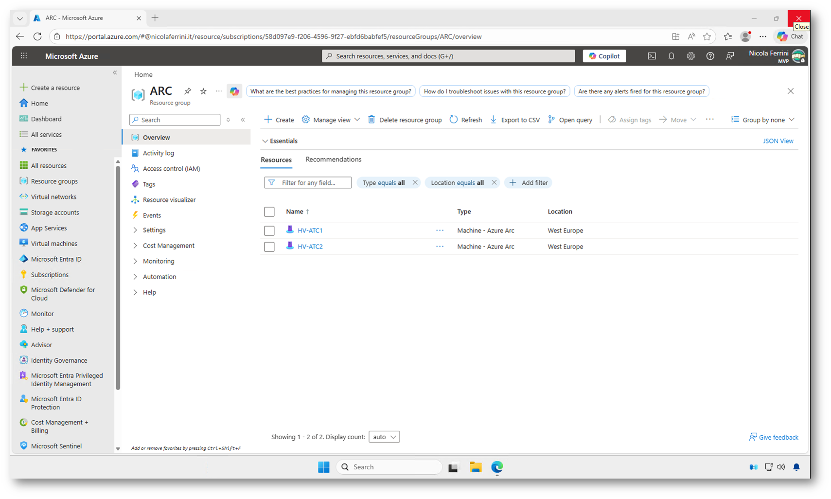 Verifichiamo inoltre che i nodi siano stati registrati correttamente in Azure Arc, condizione necessaria per poter distribuire l’estensione di Network HUD dal portale Azure e sfruttare le funzionalità di gestione integrate.