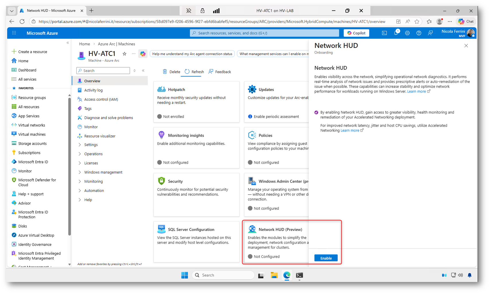 Accedete al portale Azure e aprite la sezione Machines – Azure Arc, quindi selezionate uno dei nodi del cluster su cui volete abilitare la funzionalità. All’interno della pagina del server troverete la tile dedicata a Network HUD: da qui potete avviare l’abilitazione dell’estensione con un semplice clic su Enable.