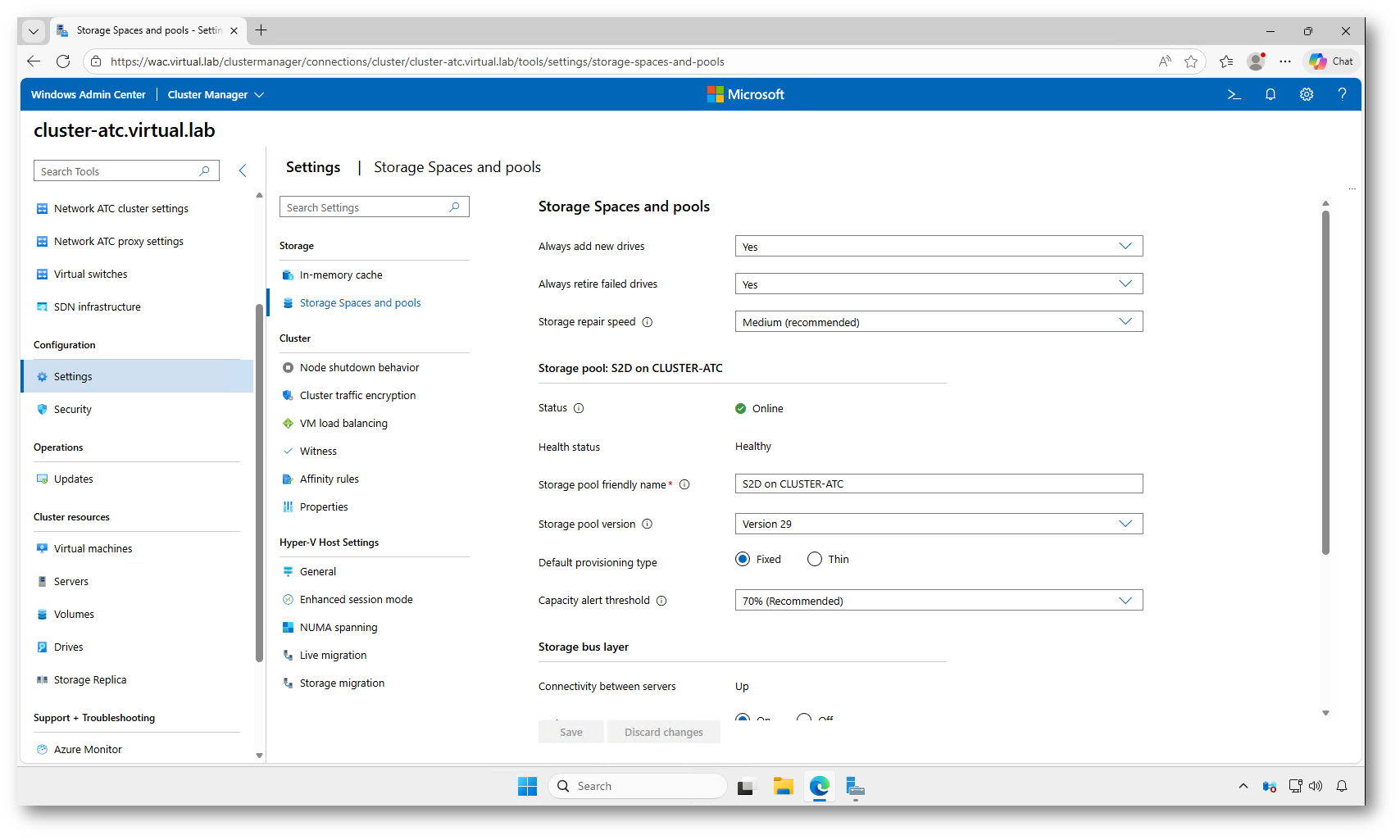 Figura 2: Pool Storage Spaces Direct attivo e in stato Healthy nelle impostazioni del cluster