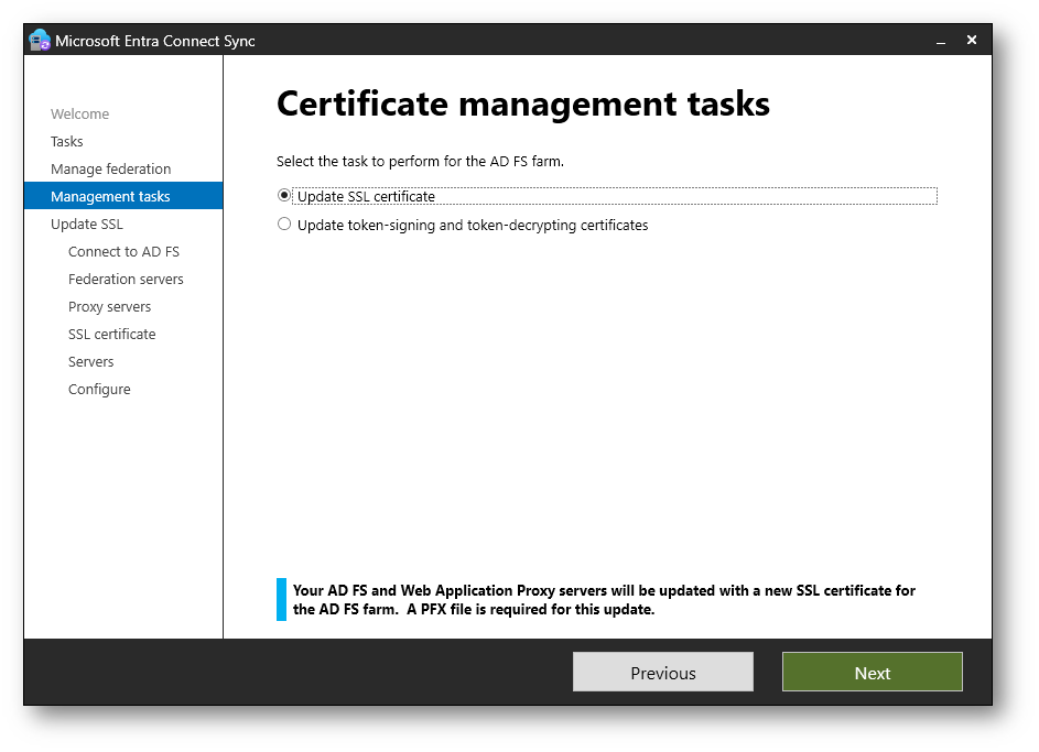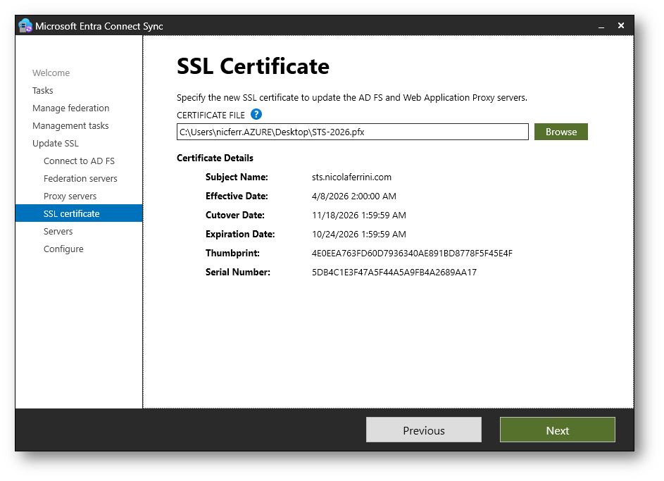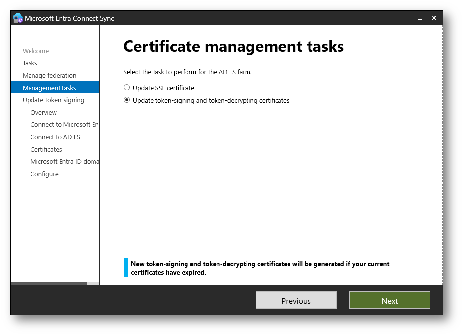 L’opzione Update token-signing and token-decrypting certificates, invece, permette di aggiornare i certificati utilizzati da ADFS per firmare e decifrare i token di autenticazione scambiati con Microsoft Entra ID.