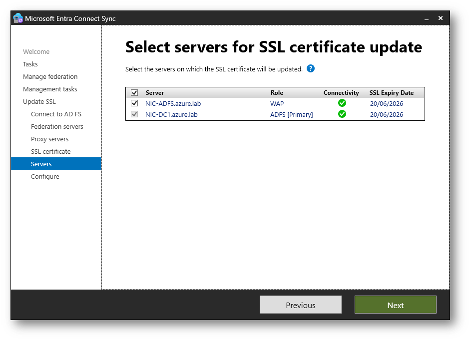 Nella schermata Select servers for SSL certificate update verificate che siano selezionati tutti i server ADFS e i Web Application Proxy su cui deve essere distribuito il nuovo certificato. Controllate lo stato di connettività e proseguite con Next.