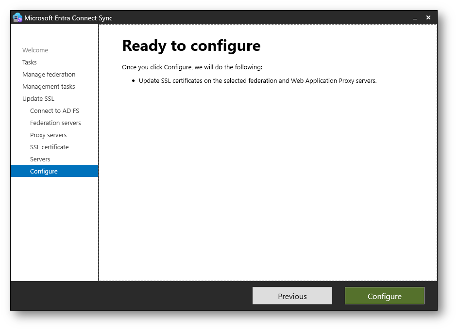 Nella schermata Ready to configure Microsoft Entra Connect esegue i controlli preliminari. Se tutte le verifiche vengono superate, potete avviare l’aggiornamento del certificato facendo clic su Configure.