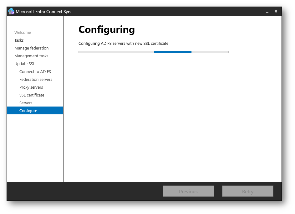 Nella schermata Configuring Microsoft Entra Connect Sync avvia la distribuzione del nuovo certificato SSL sui server Active Directory Federation Services e sui Web Application Proxy. Attendete il completamento della procedura senza interrompere il wizard.