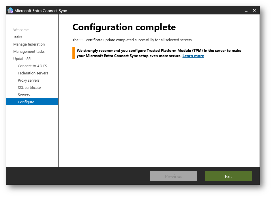 Nella schermata Configuration complete viene confermato che l’aggiornamento del certificato SSL è stato completato correttamente su tutti i server selezionati. Fate clic su Exit per chiudere il wizard di Microsoft Entra Connect Sync.