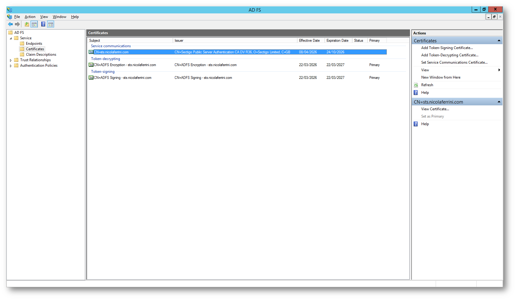 Dalla console di gestione di Active Directory Federation Services verificate che il certificato Service communications sia stato aggiornato correttamente e che le date di validità corrispondano al nuovo certificato distribuito.