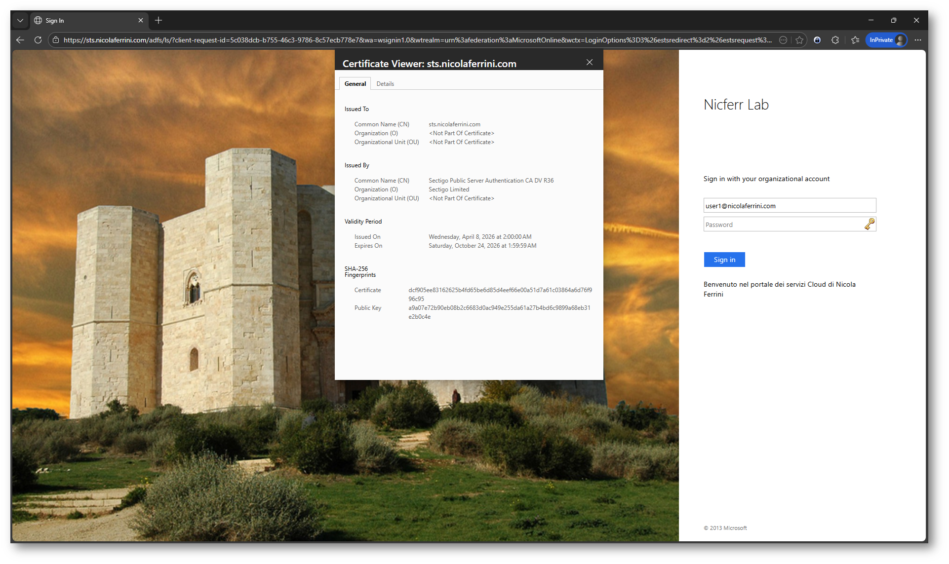 Da una macchina esterna al dominio verificate l’accesso al portale federato e controllate il certificato pubblicato sul servizio HTTPS. Aprite l’URL del servizio ADFS e visualizzate i dettagli del certificato per confermare che sia quello appena distribuito.