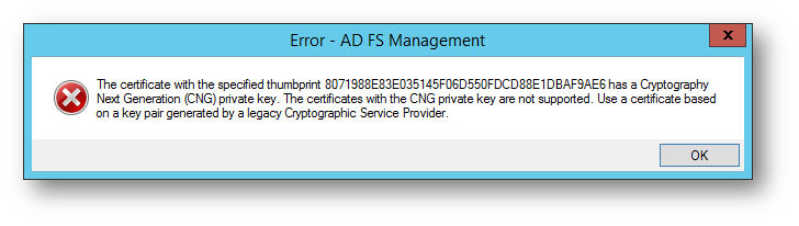 Risoluzione errore PS0025: certificato CNG non supportato da ADFS su Windows Server 2012 R2