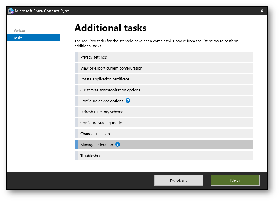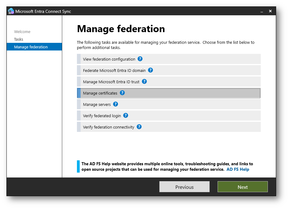 Per procedere con la gestione dei certificati ADFS, selezionate l’opzione Manage federation e fate clic su Next.