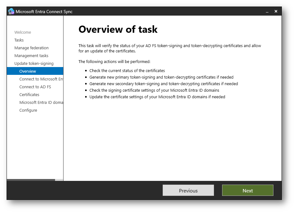 Nella schermata Overview of task viene mostrato il riepilogo delle operazioni che verranno eseguite dal wizard, tra cui la verifica dello stato dei certificati token-signing e token-decrypting, l’eventuale generazione dei nuovi certificati e l’aggiornamento della configurazione verso Microsoft Entra ID.