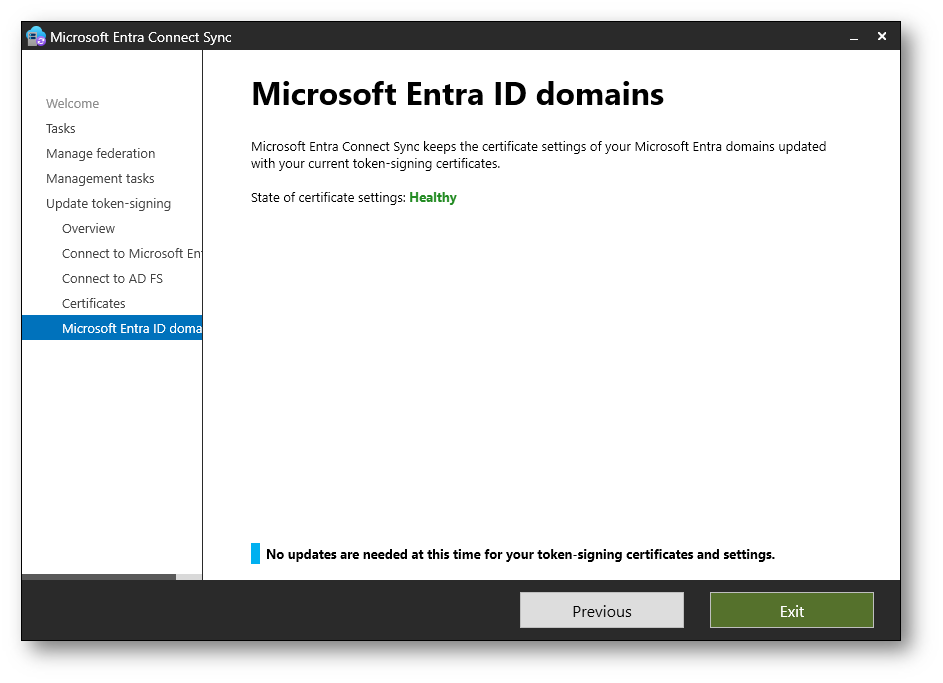 Nella schermata Microsoft Entra ID domains viene verificata la configurazione dei domini federati in Microsoft Entra ID e la corrispondenza con i certificati token-signing configurati in Active Directory Federation Services. Se lo stato risulta Healthy, non è necessario alcun intervento e potete concludere la procedura.