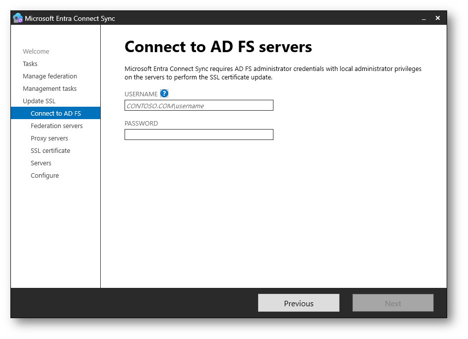 Inserite le credenziali di un account con privilegi amministrativi sui server Active Directory Federation Services. L’account deve disporre dei diritti necessari per aggiornare il certificato SSL sulla farm ADFS. Dopo aver compilato Username e Password, fate clic su Next.