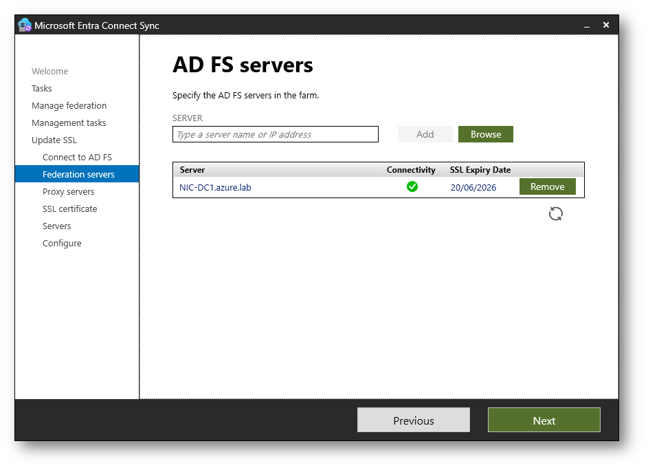 Nella schermata AD FS servers viene mostrato l’elenco dei server della farm Active Directory Federation Services. Verificate che tutti i federation server siano presenti e che lo stato di Connectivity sia positivo. Se necessario potete aggiungere ulteriori server utilizzando Add o Browse, quindi proseguite con Next.