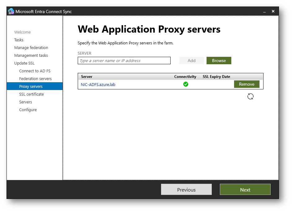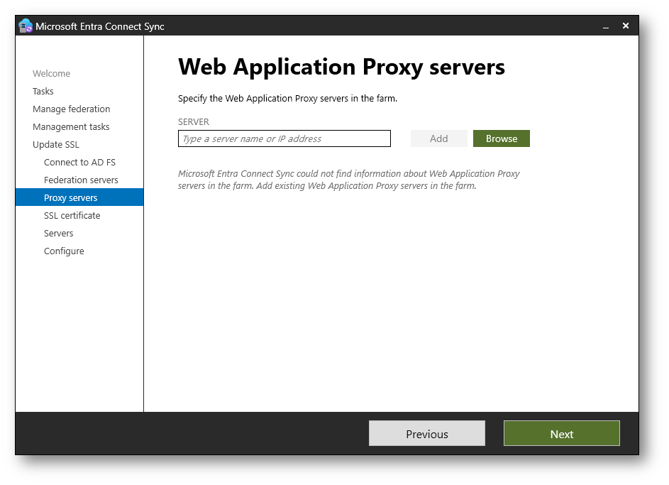 Nella schermata Web Application Proxy servers potete specificare eventuali server Web Application Proxy pubblicati davanti alla farm Active Directory Federation Services. Se presenti, aggiungeteli manualmente utilizzando Add o Browse in modo che il certificato venga aggiornato anche su questi sistemi.