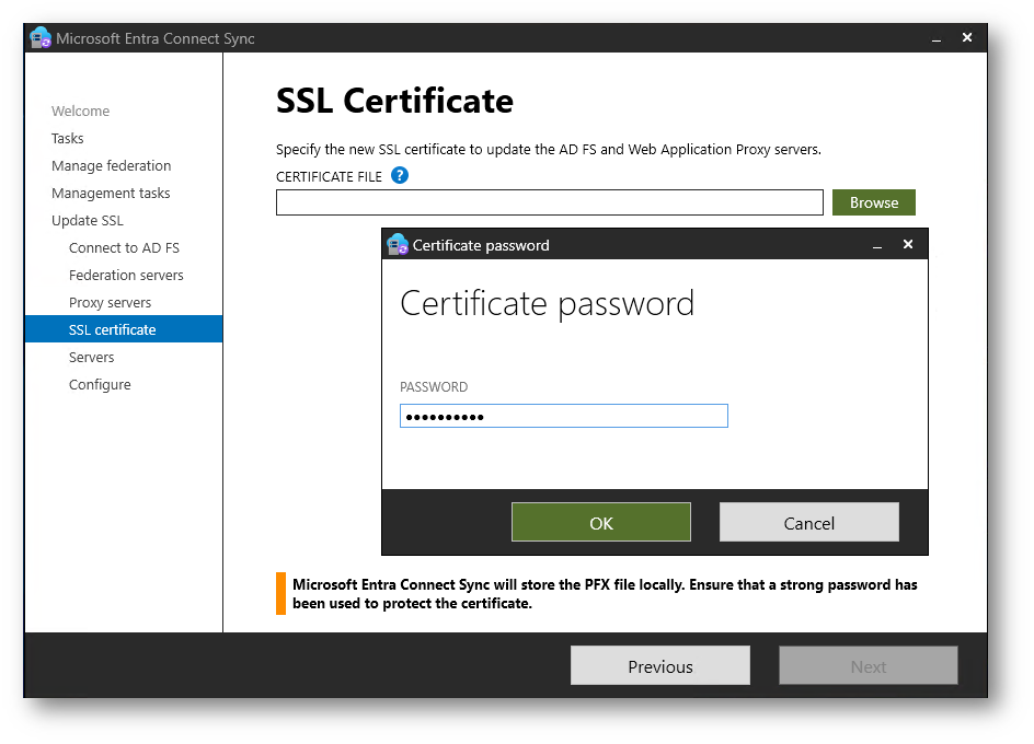 Nella schermata SSL Certificate selezionate il nuovo certificato da installare in formato PFX tramite Browse. Dopo aver indicato il file, inserite la password di protezione quando richiesto. Il certificato verrà distribuito automaticamente ai server Active Directory Federation Services e ai Web Application Proxy configurati.