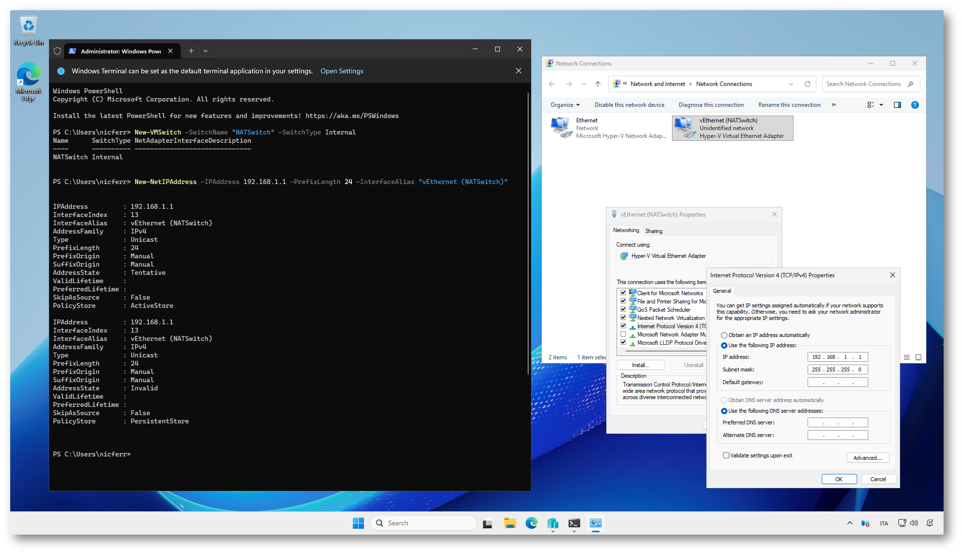 New-NetIPAddress -IPAddress 192.168.1.1 -PrefixLength 24 -InterfaceAlias "vEthernet (NATSwitch)" |