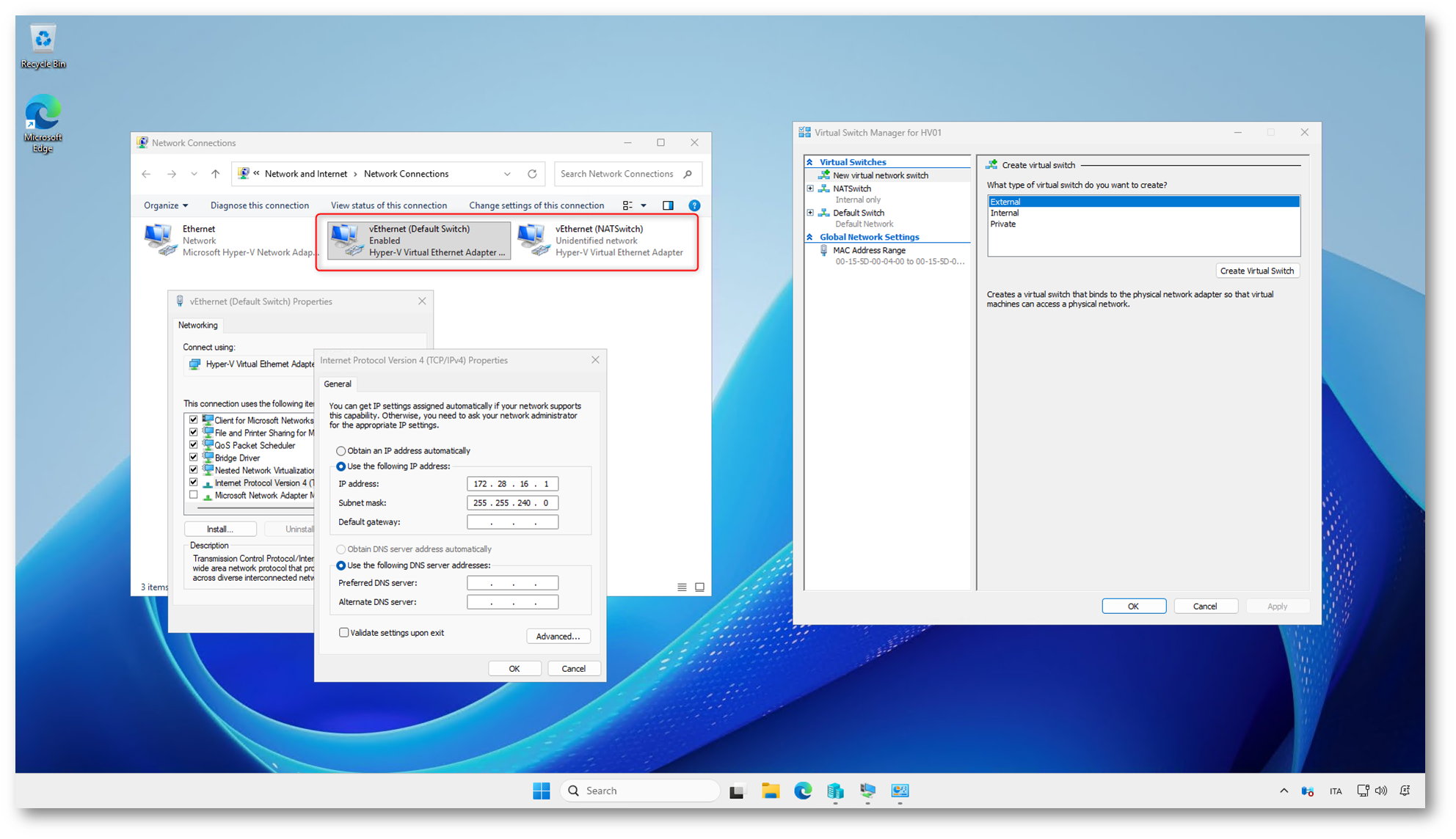 Figura 1: Creazione dello switch interno in Hyper-V e assegnazione manuale dell’indirizzo IP all’interfaccia vEthernet (NATSwitch) che fungerà da gateway per la rete NAT