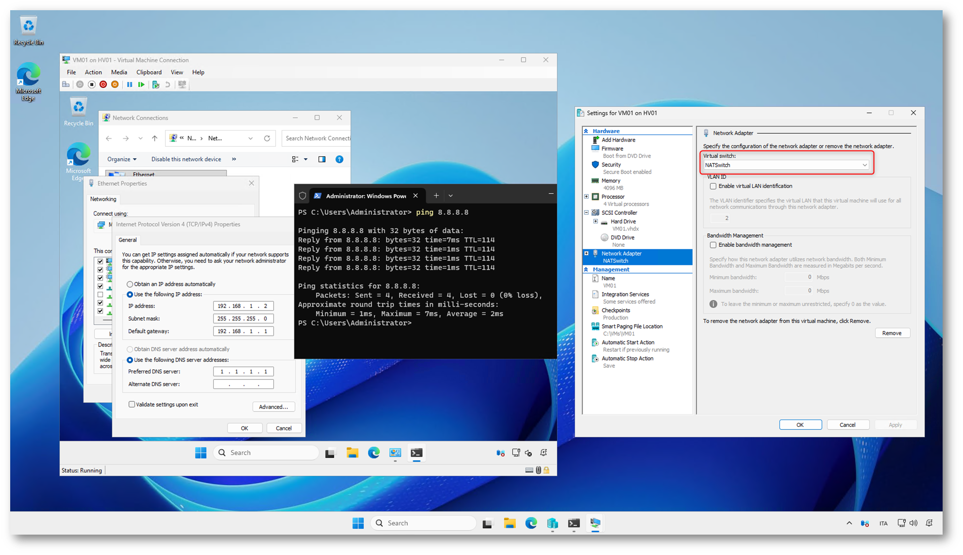 A questo punto possiamo collegare una macchina virtuale allo switch NAT appena creato e configurare manualmente i parametri di rete. Alla scheda di rete della VM assegniamo un indirizzo IP appartenente alla stessa subnet configurata sullo switch, impostando come gateway l’indirizzo dell’interfaccia vEthernet dell’host, cioè 192.168.1.1. Ovviamente se disponete di un server DHCP, collegatelo allo switch NAT e configuratelo opportunamente con i parametri della rete.