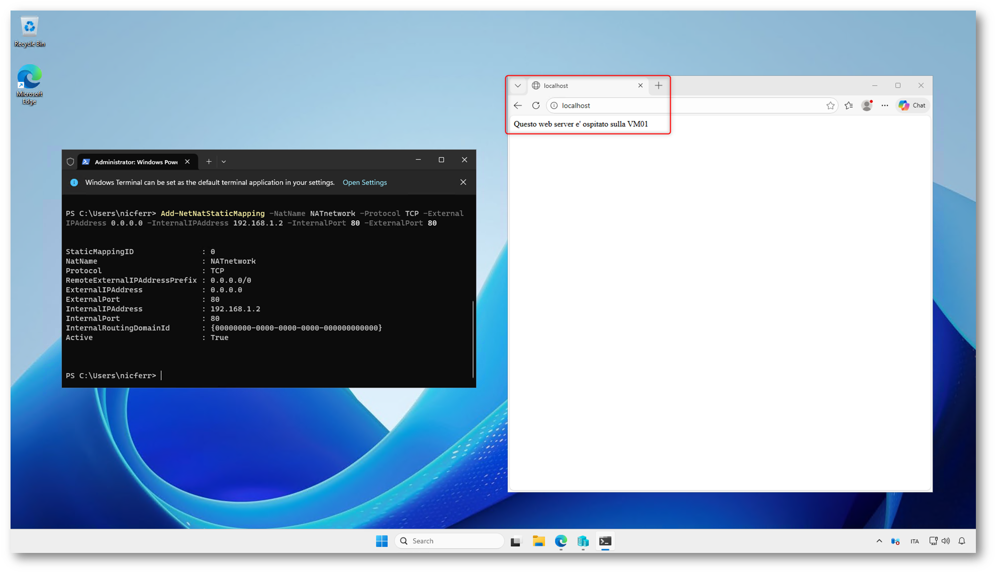 Figura 4: Creazione della regola di port forwarding sulla porta 80 e verifica dell’accesso al web server installato sulla VM con indirizzo 192.168.1.2 direttamente dall’host Hyper-V
