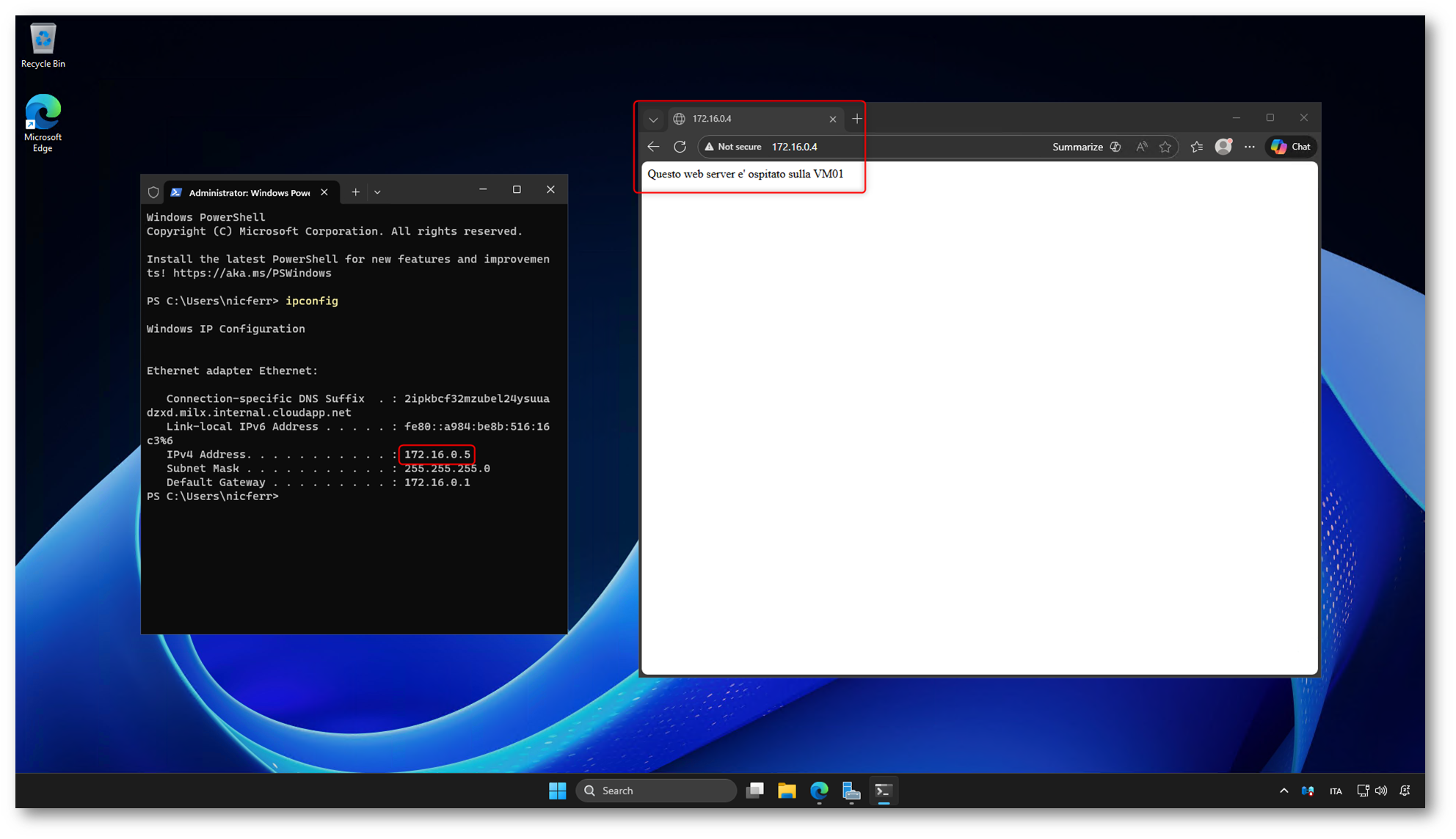 Quando un client della rete si collega, ad esempio, a 172.16.0.4, la richiesta arriva prima all’host. A questo punto entra in gioco la regola di port forwarding configurata con NetNatStaticMapping: l’host intercetta il traffico sulla porta 80 e lo inoltra verso la VM interna con indirizzo 192.168.1.2.