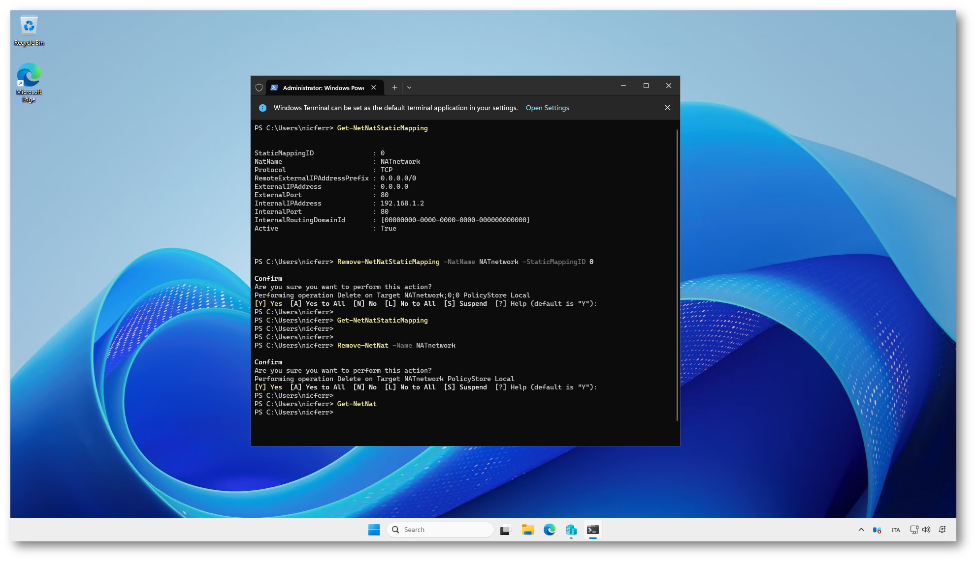 Figura 2: Creazione della rete NAT con il comando New-NetNat, specificando il prefisso IP interno che verrà tradotto verso la rete esterna
