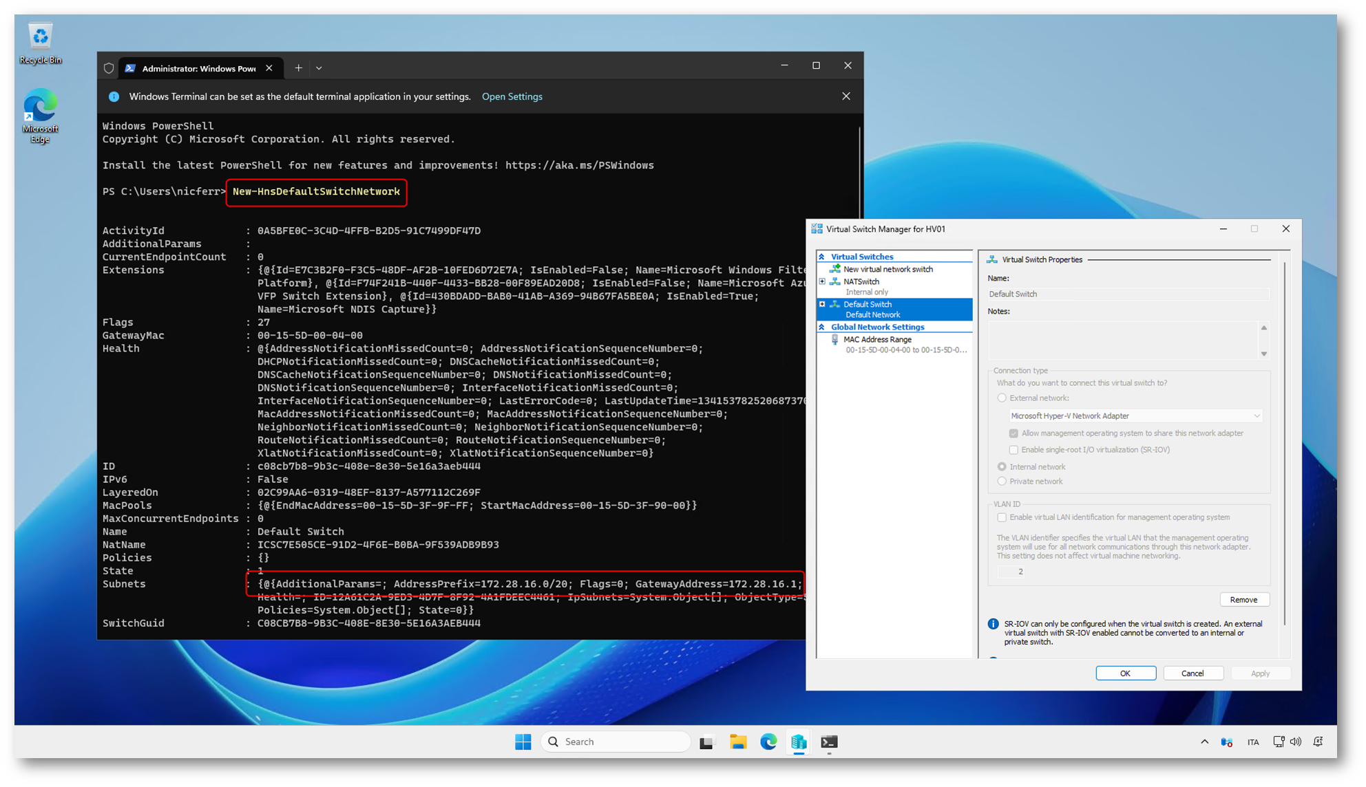 Il Default Switch non è gestito con i normali cmdlet di Hyper-V, perché dietro le quinte utilizza HNS, acronimo di Host Networking Service. Si tratta del servizio di Windows che gestisce le reti virtuali, il NAT e le policy di rete utilizzate soprattutto dagli scenari con container e dalle funzionalità automatiche del sistema, come appunto il Default Switch.