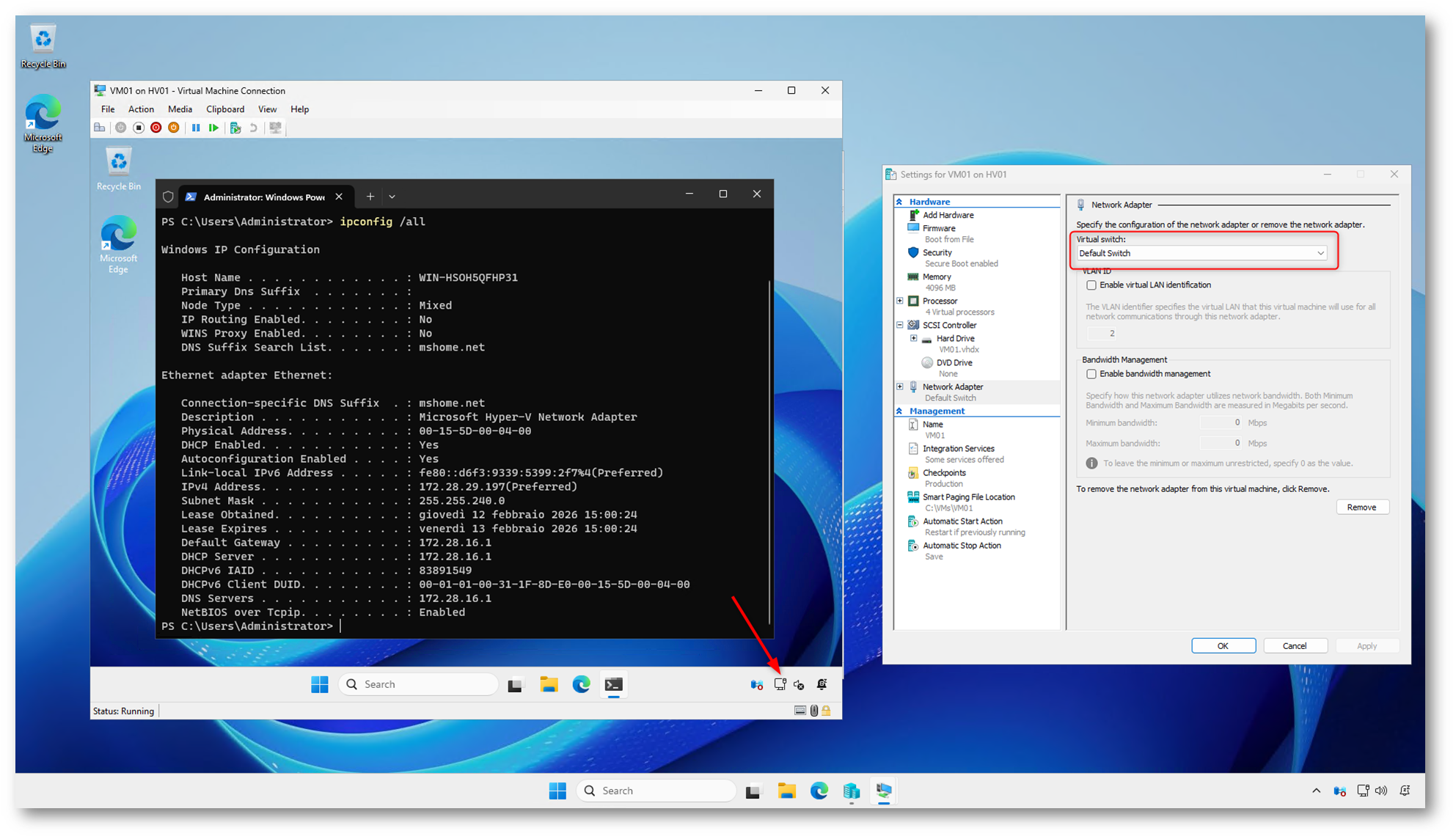 Per verificare il funzionamento del Default Switch, è sufficiente collegare la macchina virtuale allo switch e lasciare la scheda di rete configurata in DHCP. In questo modo sarà il servizio interno dello switch ad assegnare automaticamente tutti i parametri di rete.