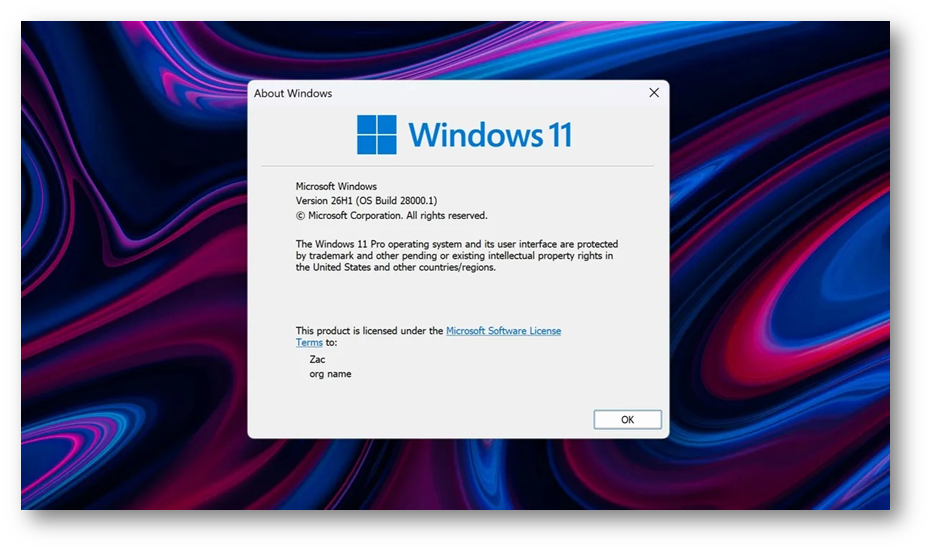 Figura 1 – “About Windows” di Windows 11 26H1 nella sua prima versione (Immagine: Windows Central)