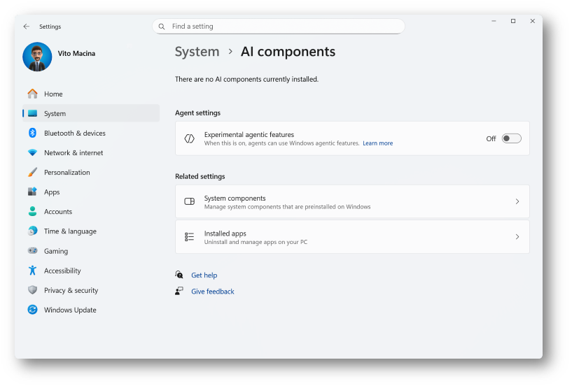 Figura 1 – UI che mostra l’app Impostazioni di Windows 11 (Insider Preview), in particolare in Sistema > Componenti AI, dove è presente la configurazione “Funzionalità agentiche sperimentali”.