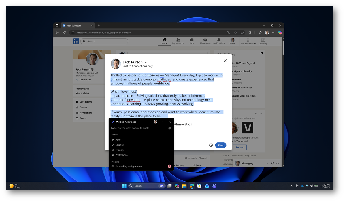 Figura 11 – UI che mastra Writing Assistance su un post di LinkedIn