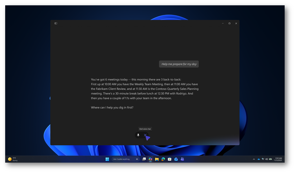 È possibile avviare una conversazione bidirezionale con Copilot, ricevendo risposte vocali in tempo reale basate sia sui dati web che sui dati di lavoro. La funzionalità Voice in Microsoft 365 Copilot è già disponibile.