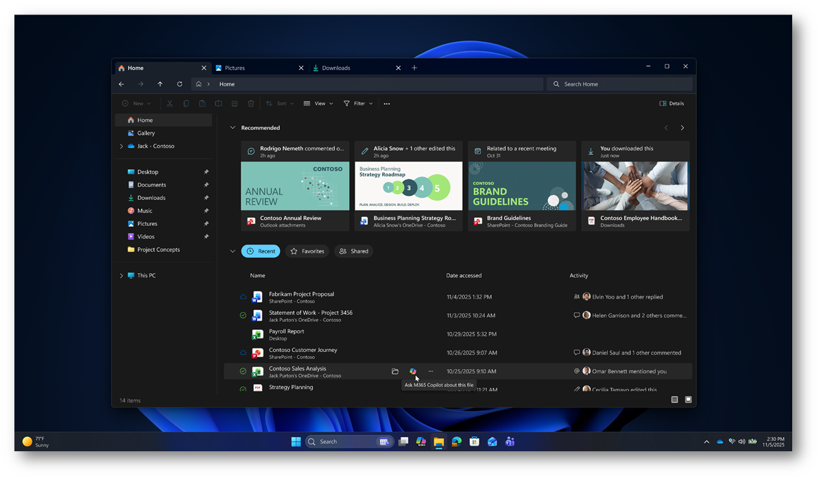 Nella home del File Explorer, gli utenti potranno passare il puntatore del mouse sopra i file e chiedere assistenza o approfondimenti direttamente a M365 Copilot. Questa funzionalità sarà distribuita entro la fine del 2025.
