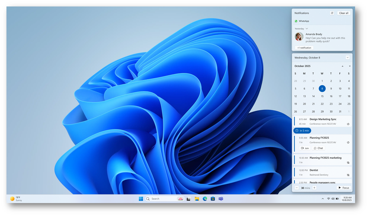 In arrivo a dicembre 2025, la nuova vista Agenda sarà disponibile nel Centro Notifiche di Windows 11 offrendo un elenco cronologico dei tuoi prossimi eventi/impegni, perfettamente integrato con il calendario in un’unica interfaccia.