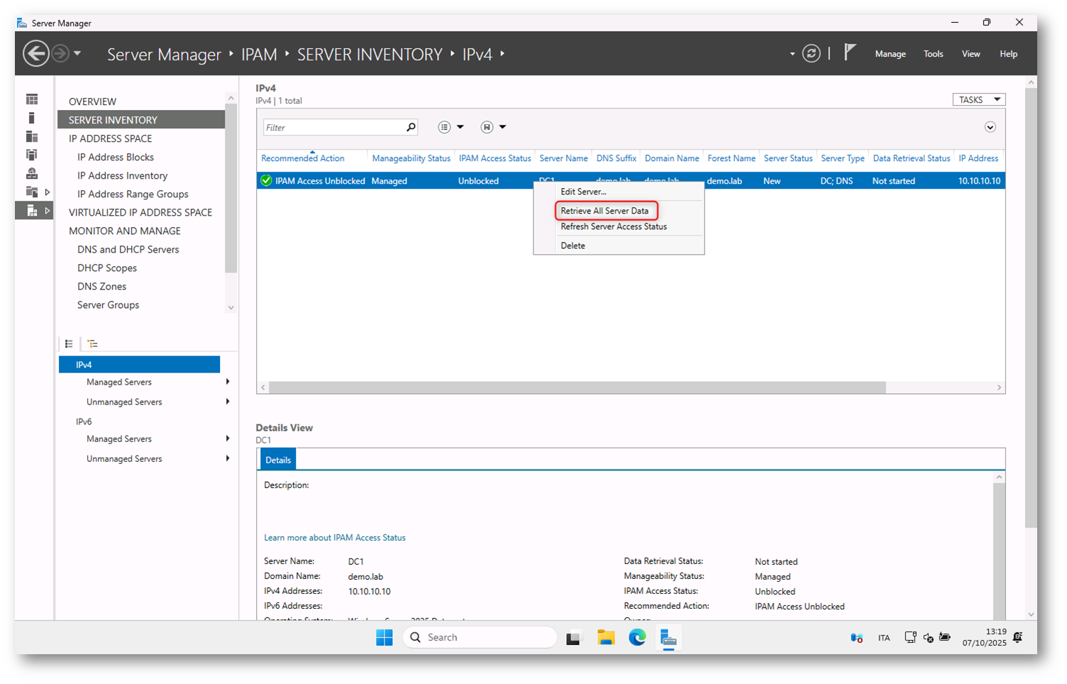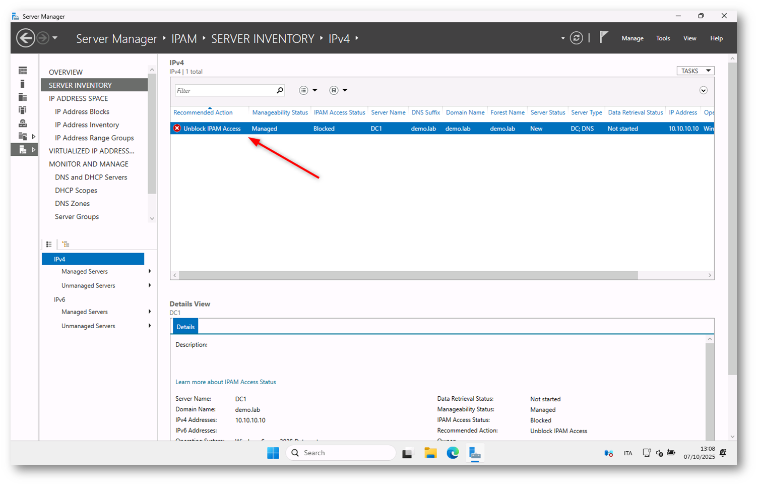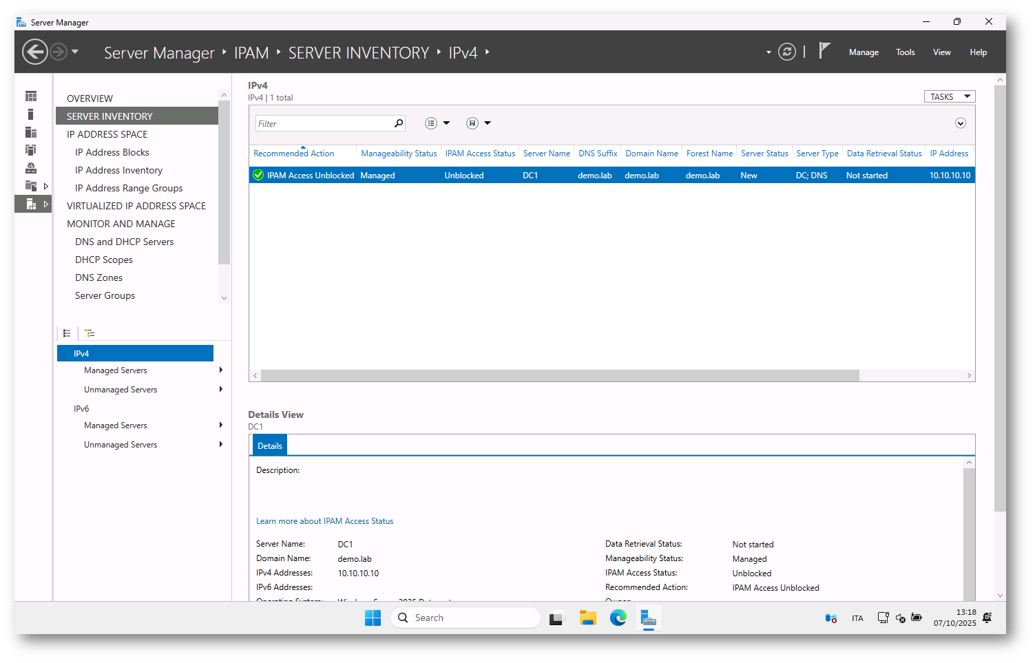 1. Connect to IPAM server – Connessione al server IPAM (in questo caso IPAM.demo.lab).