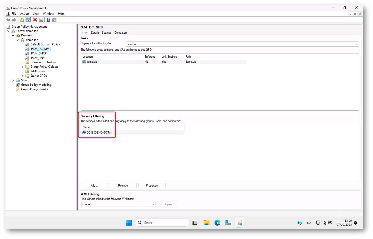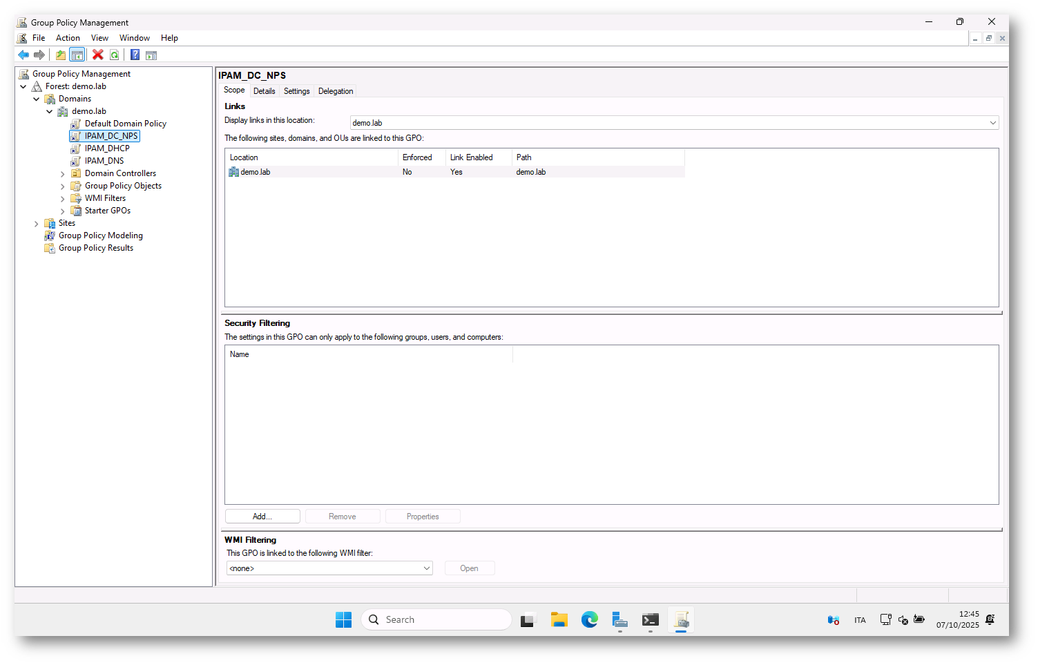 Figura 20: Security Filtering della GPO IPAM_DC_NPS