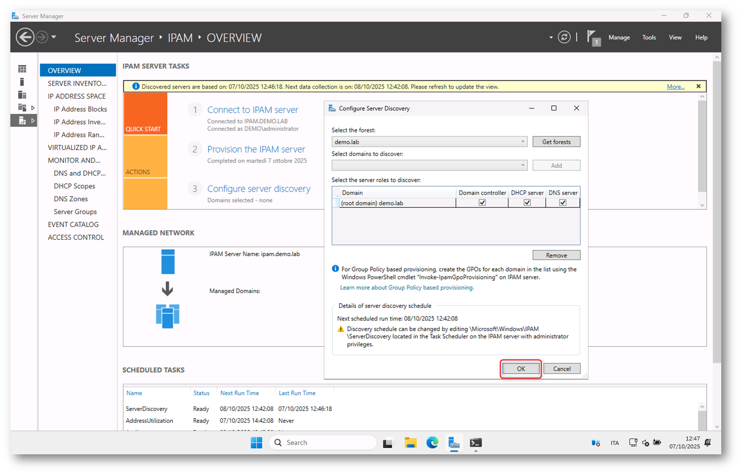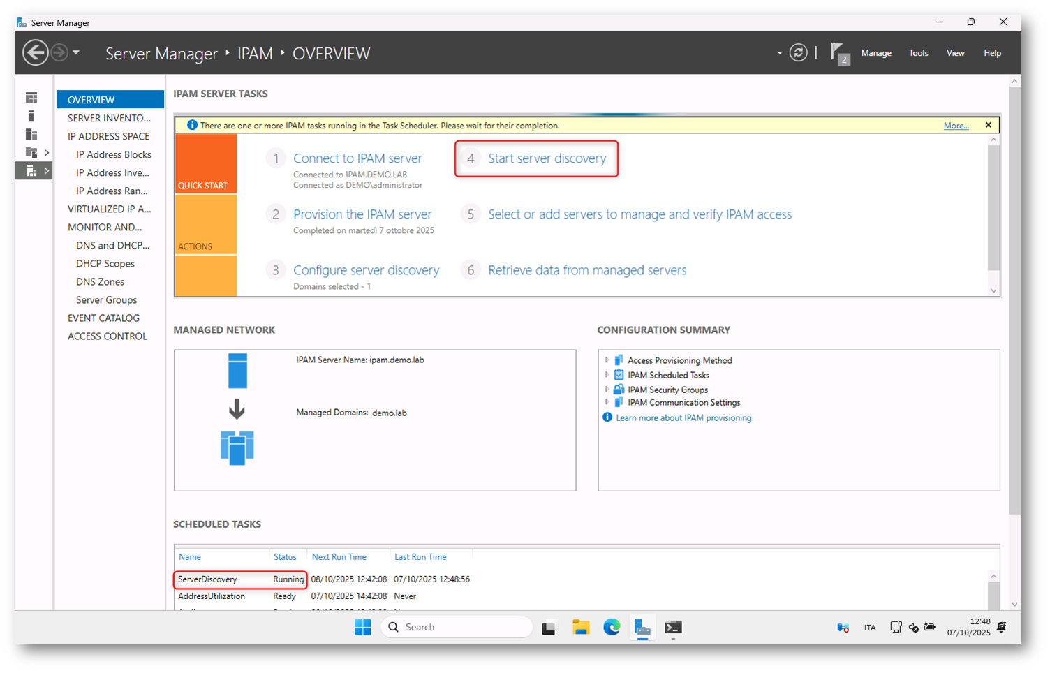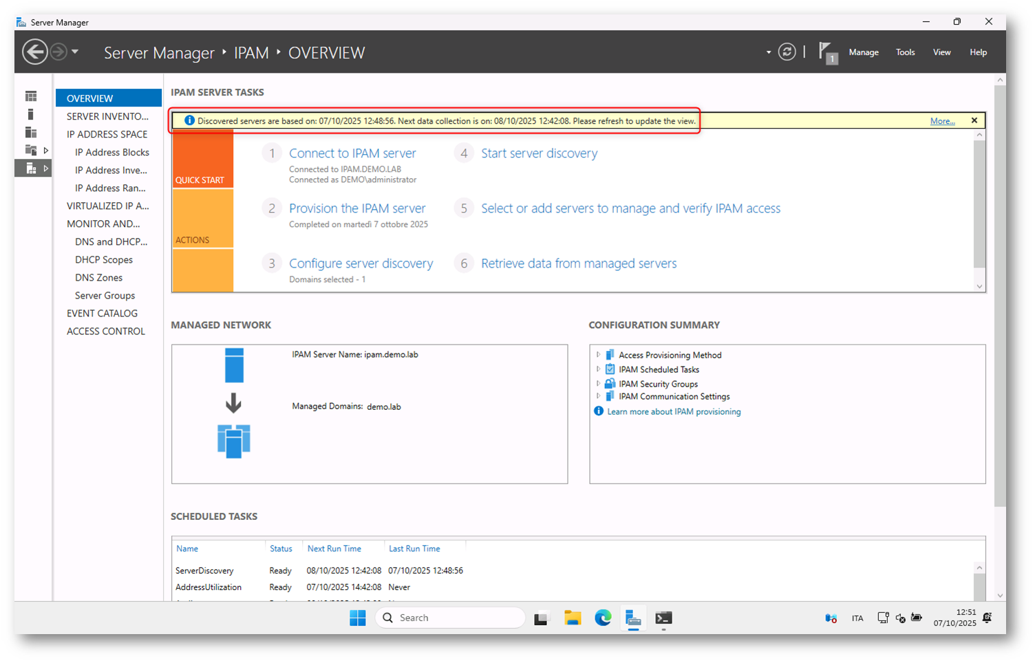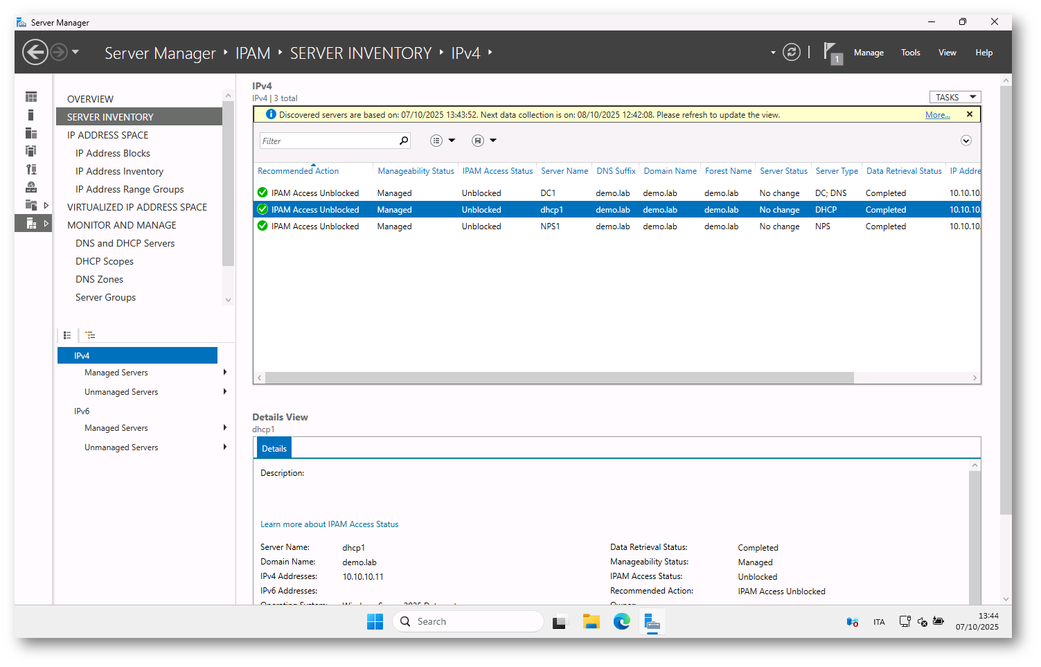 In questo stato IPAM può iniziare la raccolta automatica dei dati di configurazione, delle lease DHCP, delle zone DNS e dei log di sicurezza, consentendo una visione centralizzata dell’intera infrastruttura IP.