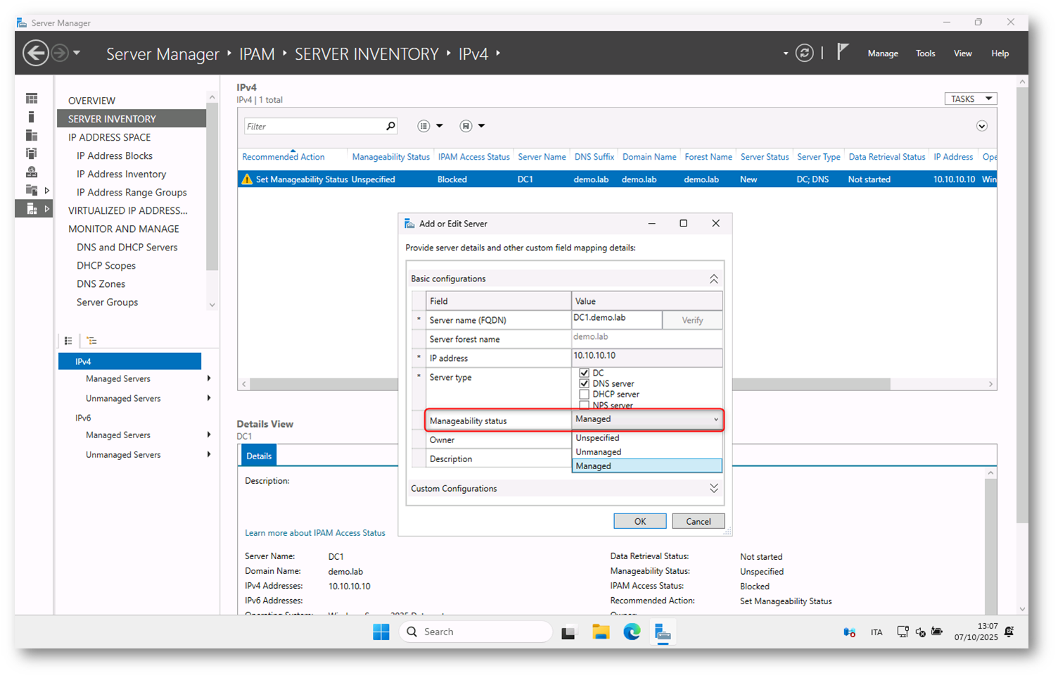 Nel nostro esempio il server DC1 (che svolge i ruoli di Domain Controller e DNS Server) viene impostato su Managed, abilitando così la gestione automatizzata tramite IPAM.